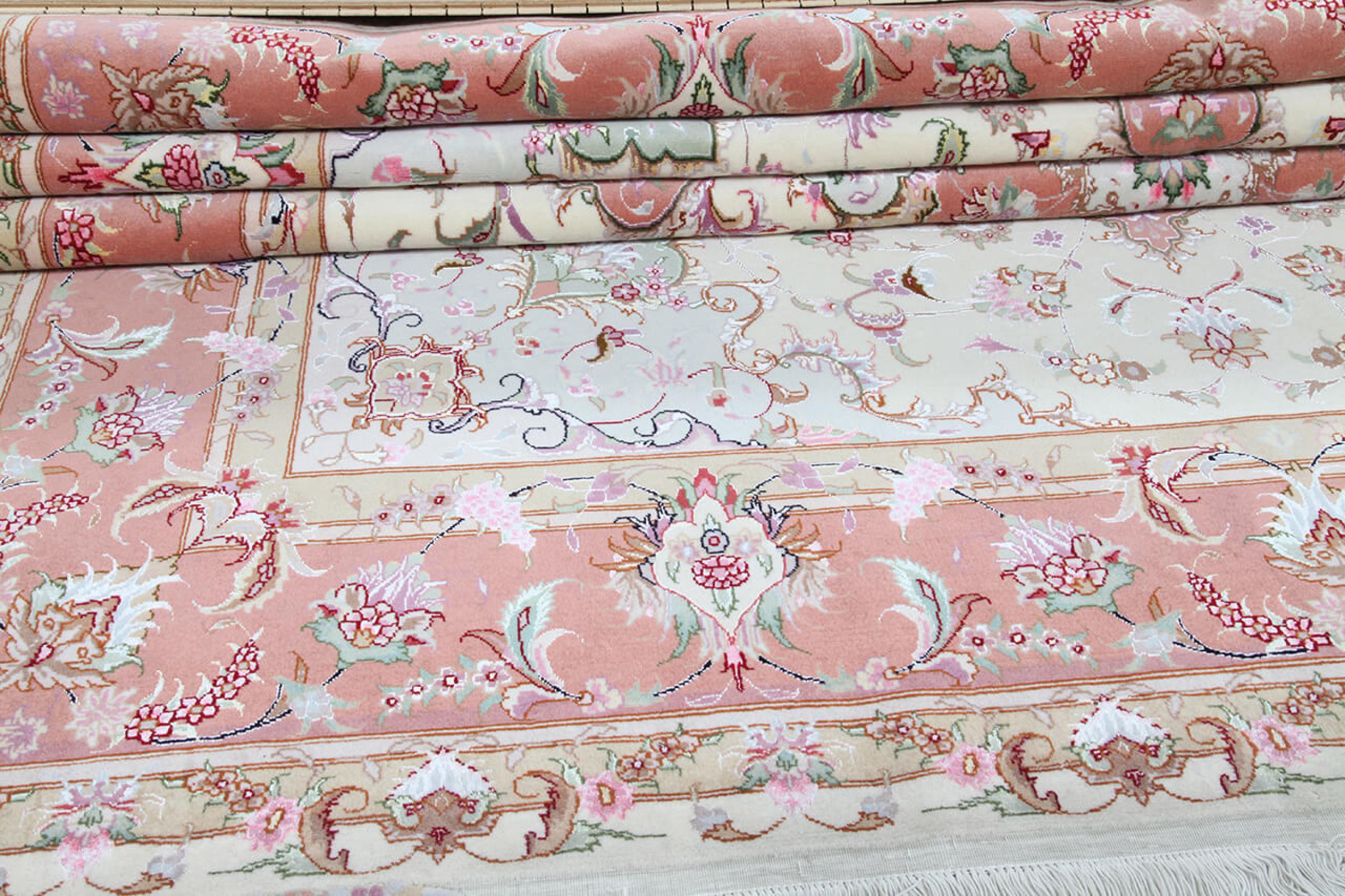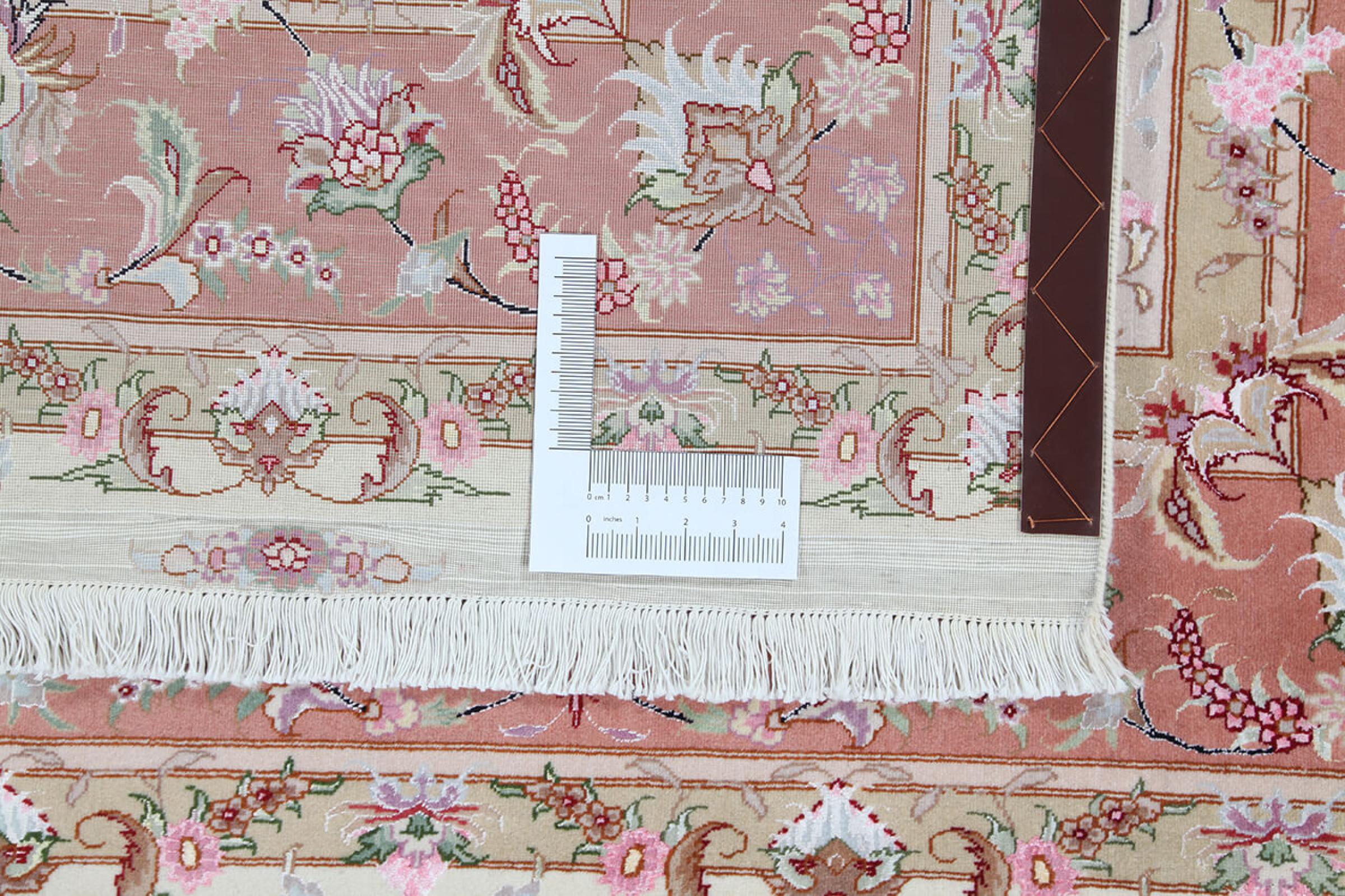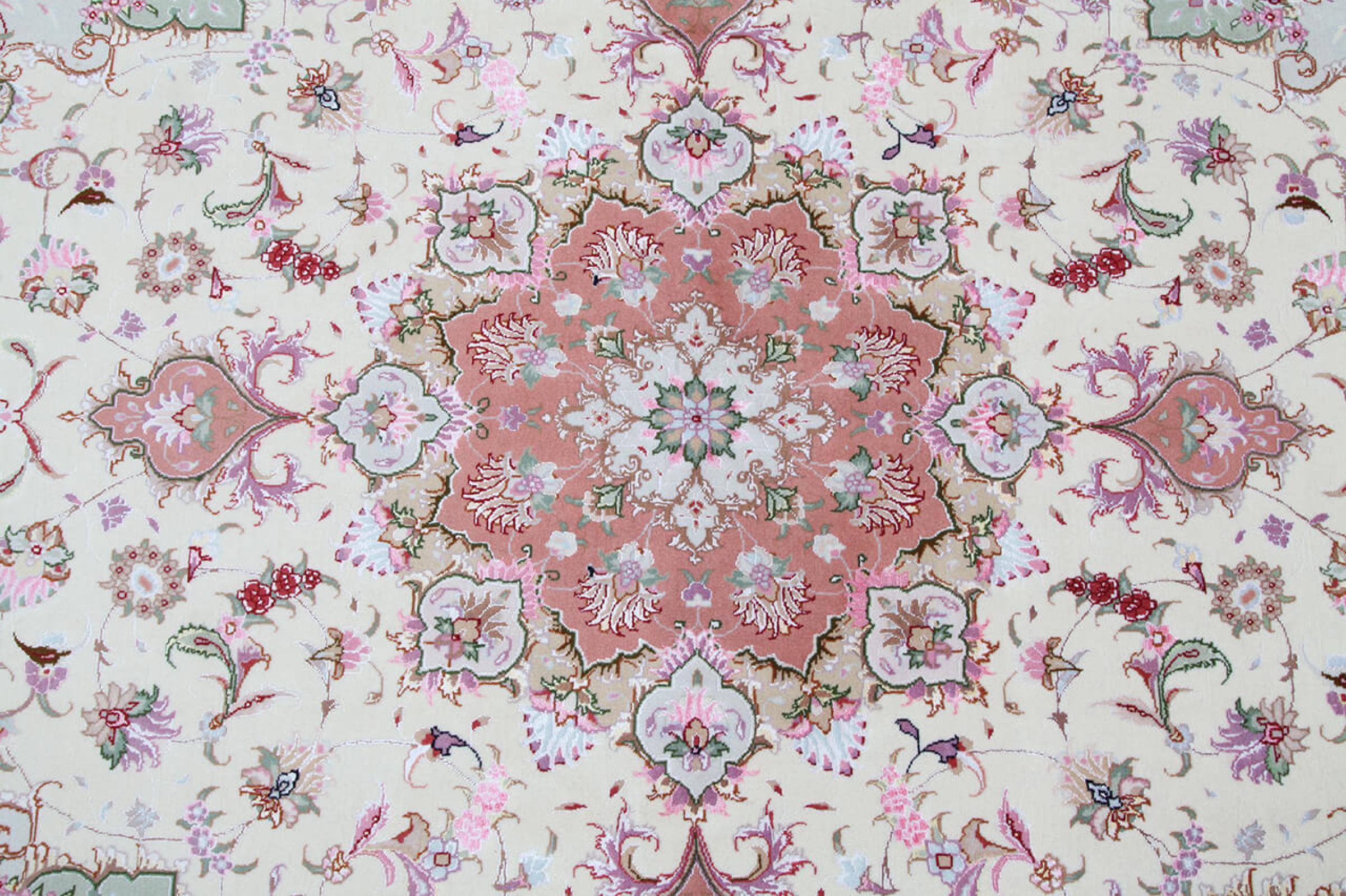 このタブリーズは、イラン北西部、同じ名前の職人都市タブリーズで手編みされました。 高品質のウールと天然シルクのみを使用しました。 そのパターンと装飾要素により、東洋を最も美しく反映しています。 タブリーズ絨毯は非常によく知られており、人気があります。 これらのカーペットの Raj 数は、長さ 7 cm にわたるノットの数を反映しています。 たとえば、タブリーズ 60Raj のノットは 1 平方メートルあたり約 700,000 です。