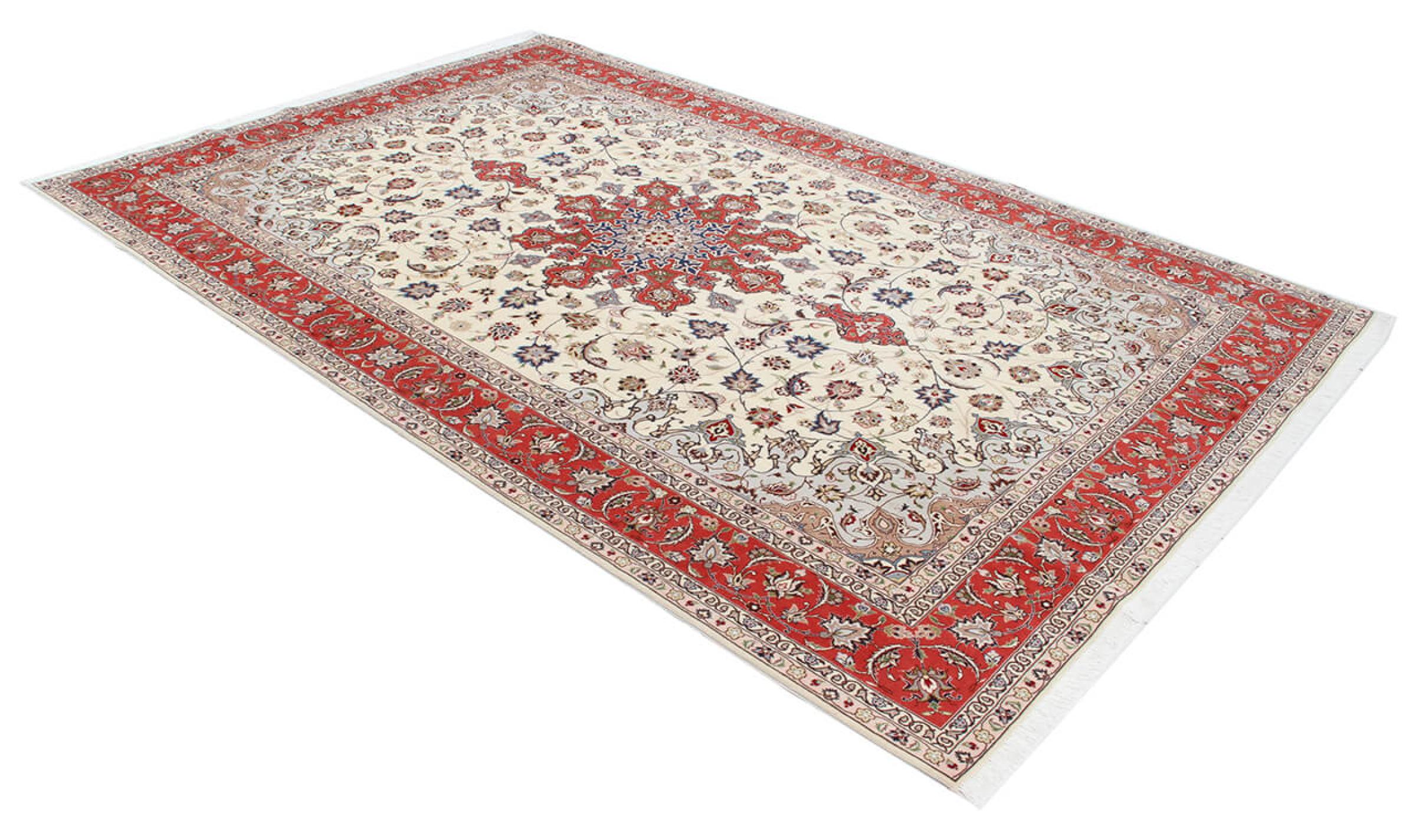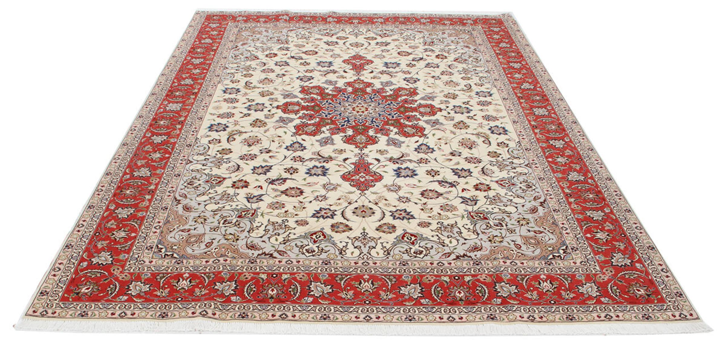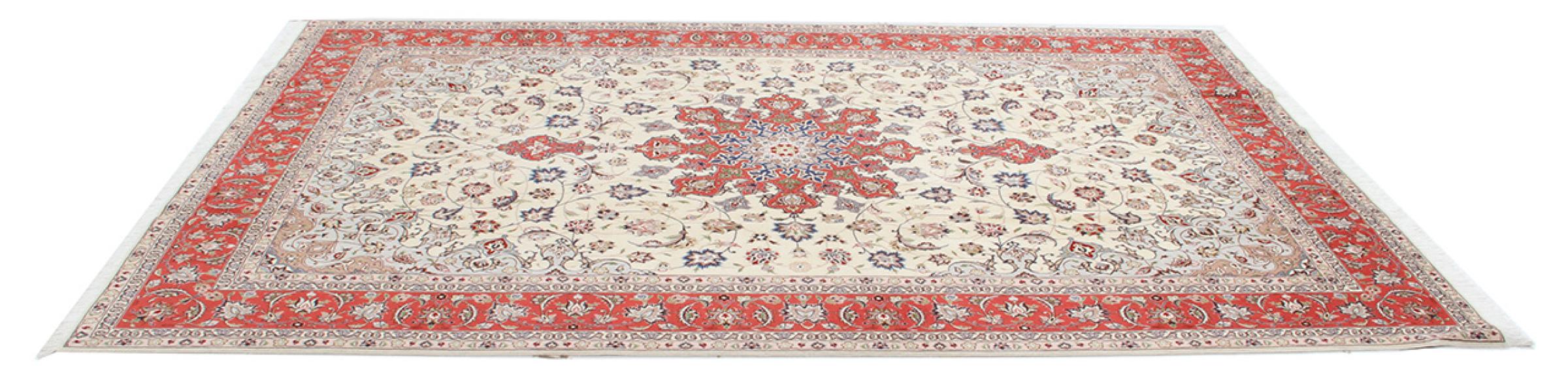 このタブリーズは、イラン北西部、同じ名前の職人都市タブリーズで手編みされました。 高品質のウールと天然シルクのみを使用しました。 そのパターンと装飾要素により、東洋を最も美しく反映しています。 タブリーズ絨毯は非常によく知られており、人気があります。 これらのカーペットの Raj 数は、長さ 7 cm にわたるノットの数を反映しています。 たとえば、タブリーズ 60Raj のノットは 1 平方メートルあたり約 700,000 です。