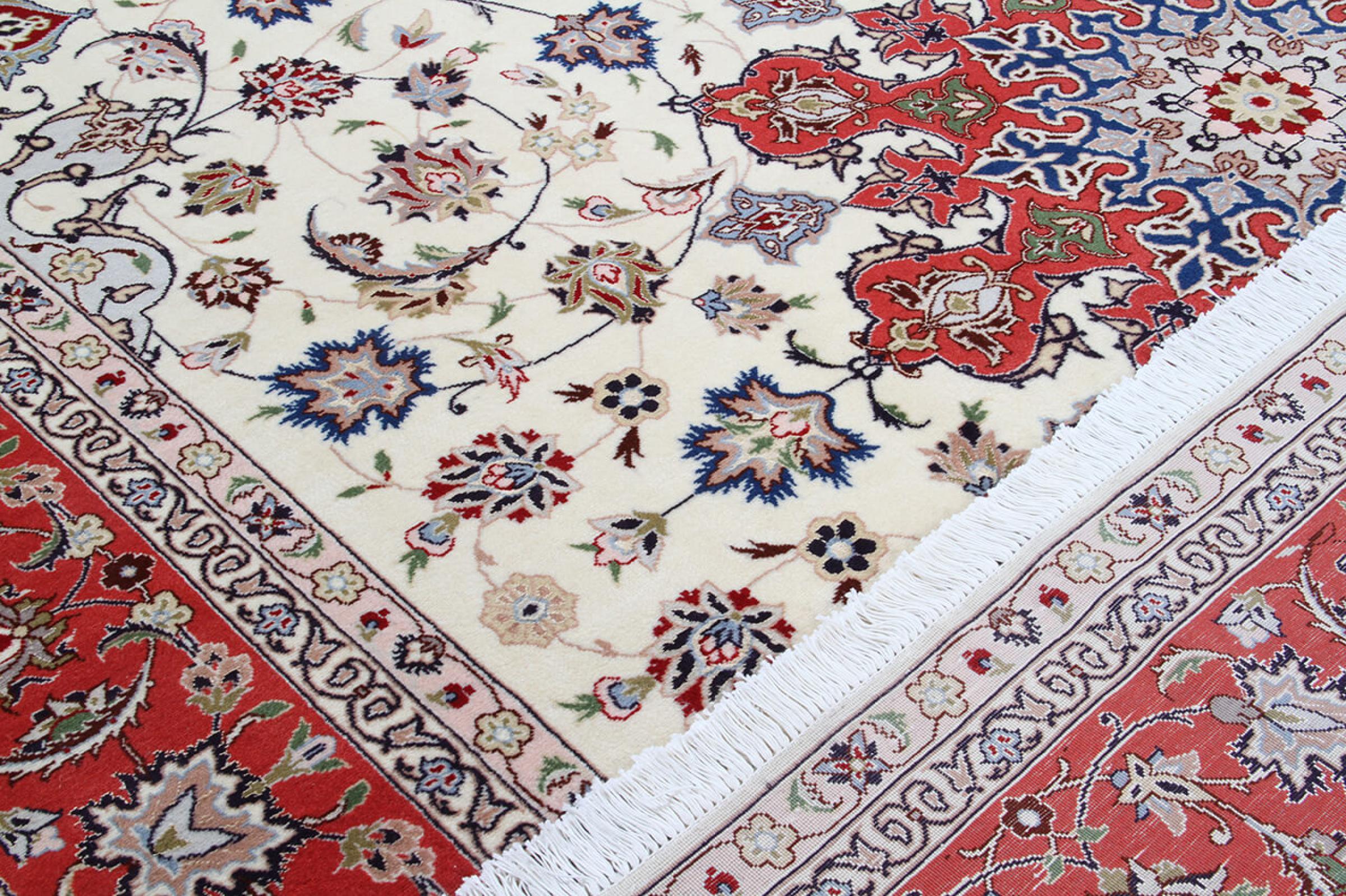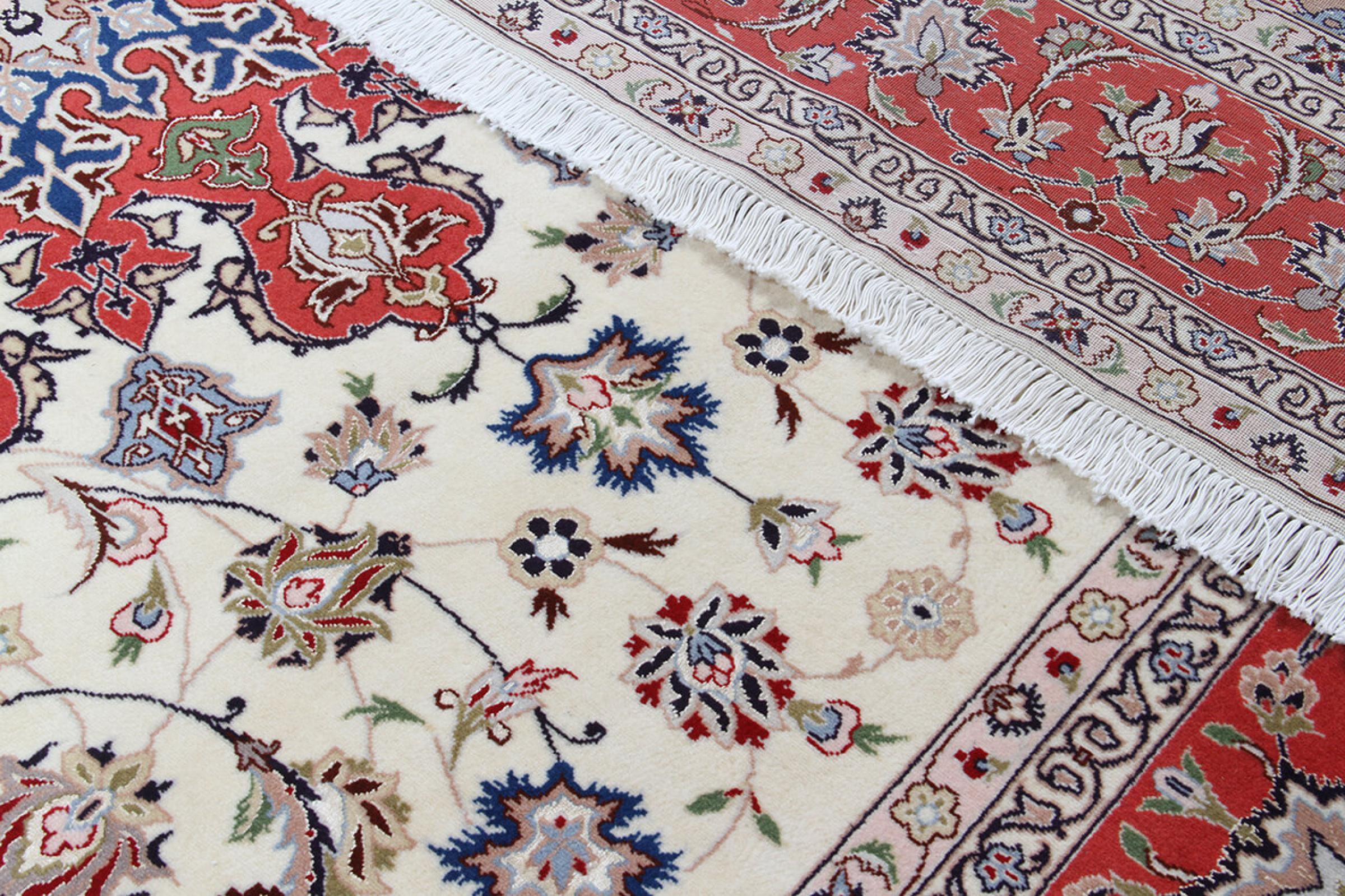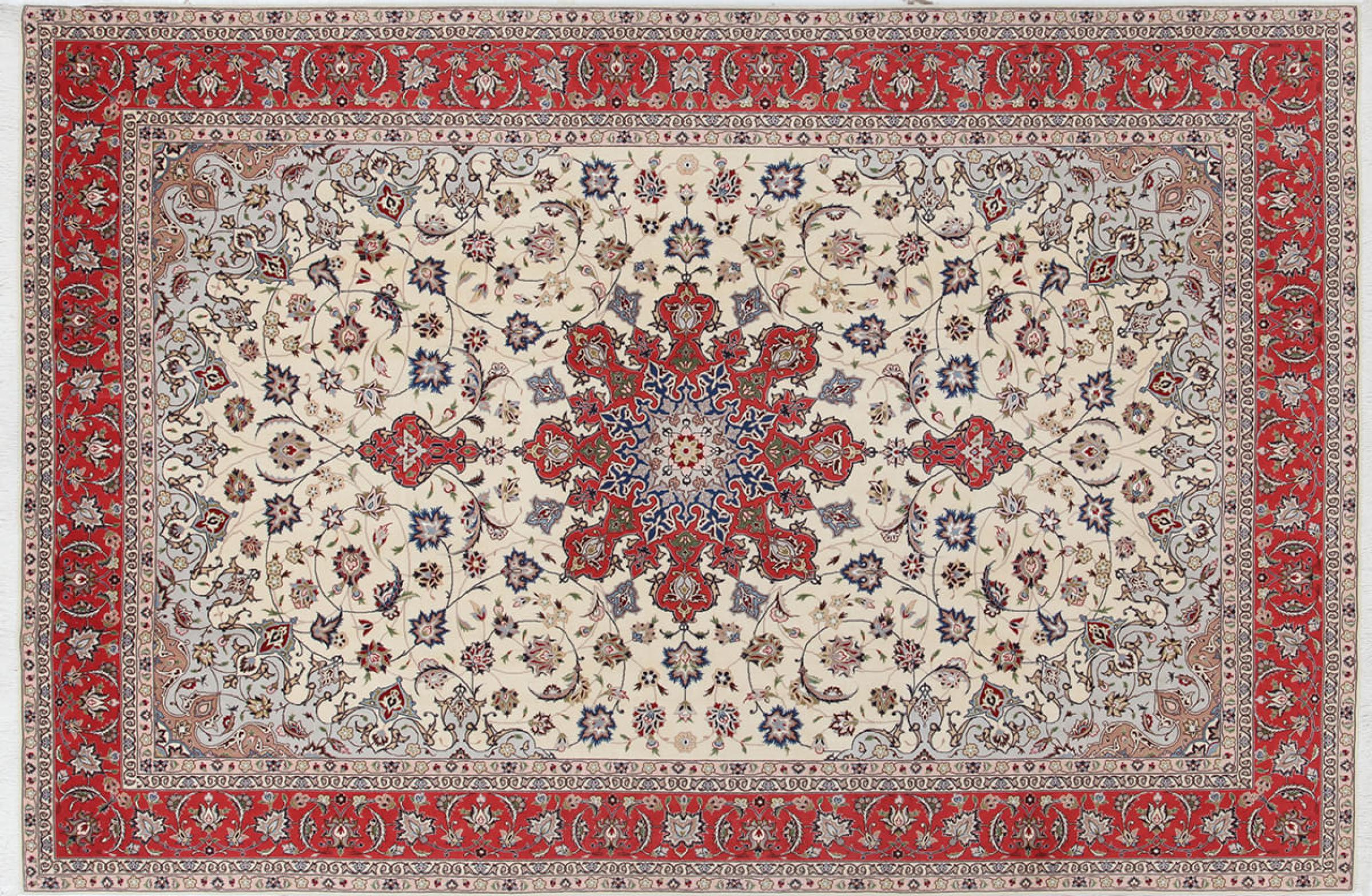 タブリーズはイランで最大の都市の1つであり、ペルシャ絨毯で最も有名な絨毯の州の1つです。 タブリーズカーペットには、しばしば「Raj」番号が付けられています。 この数値が高いほど、ノット密度を示すため、カーペットは細かくなります。 タブリーズの平均的なペルシャ絨毯(40ラージ)と非常に細かい絨毯(80ラージ)の両方があります。