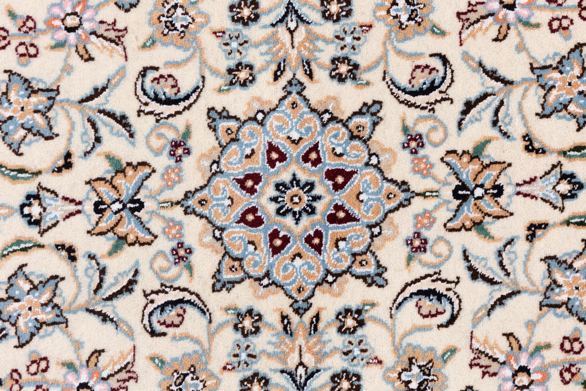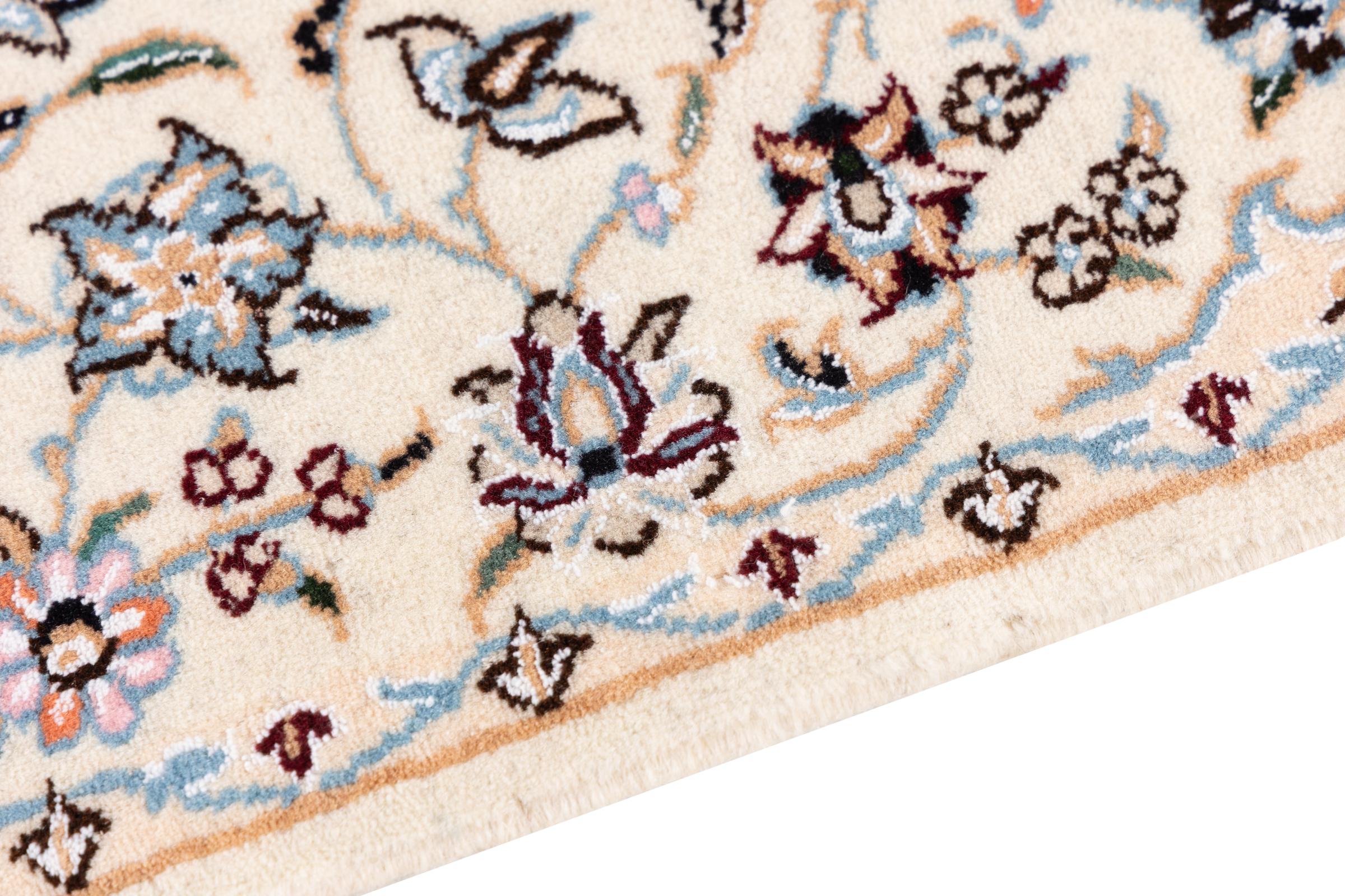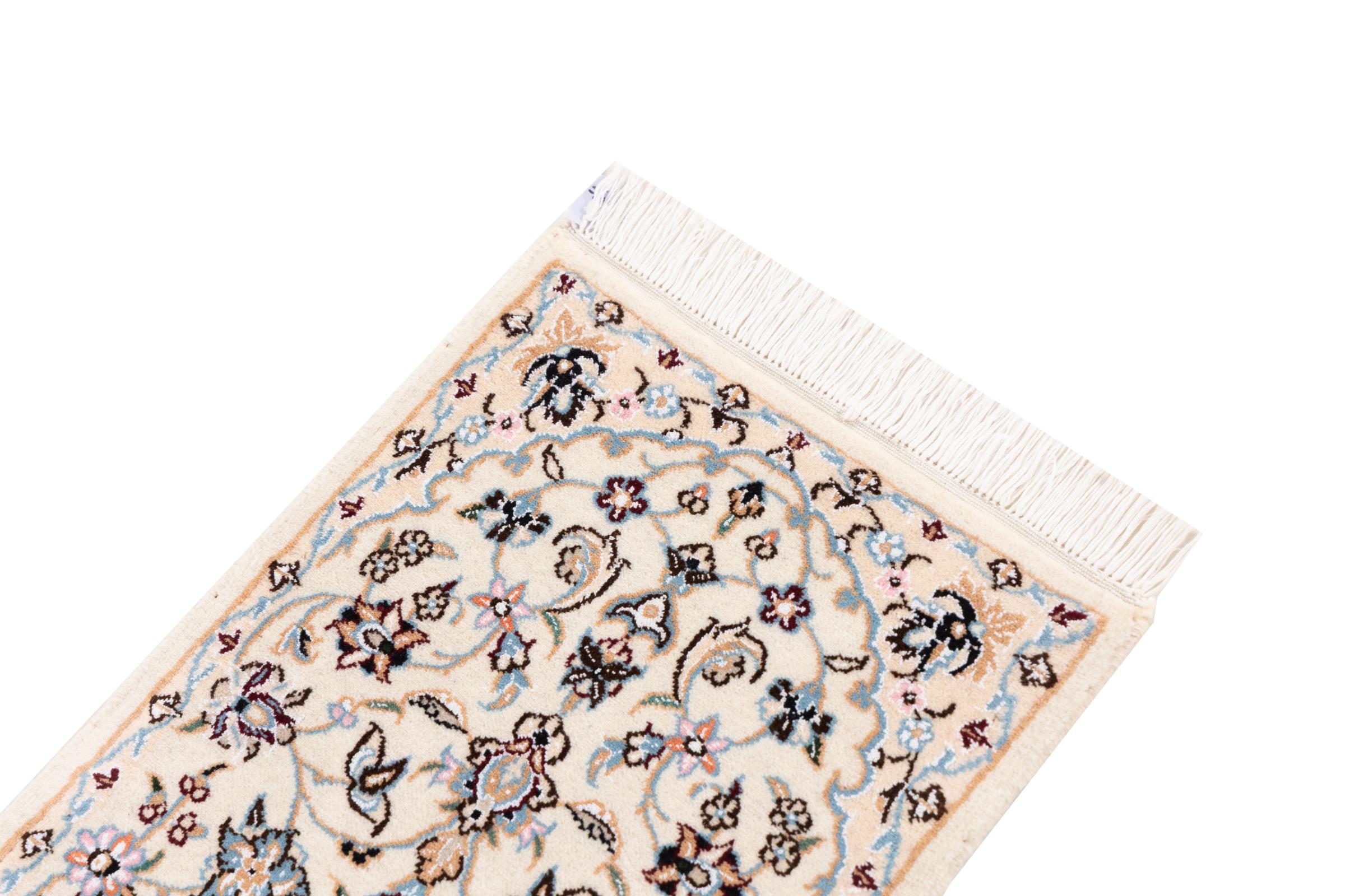 このナインのカーペットは 9La に分類されます。 優れた品質、曲線パターンを備えた美しいオリエンタルなデザインは、すべてのバイヤーを喜ばせます。 このペルシャ絨毯は、ダシュテ・カヴィル砂漠の西端にあるナイン市で高品質のウールと天然シルクを使って手織りされました。 9La Nain は 12La よりもかなり細かく、すでに美しいディテールを示しています。