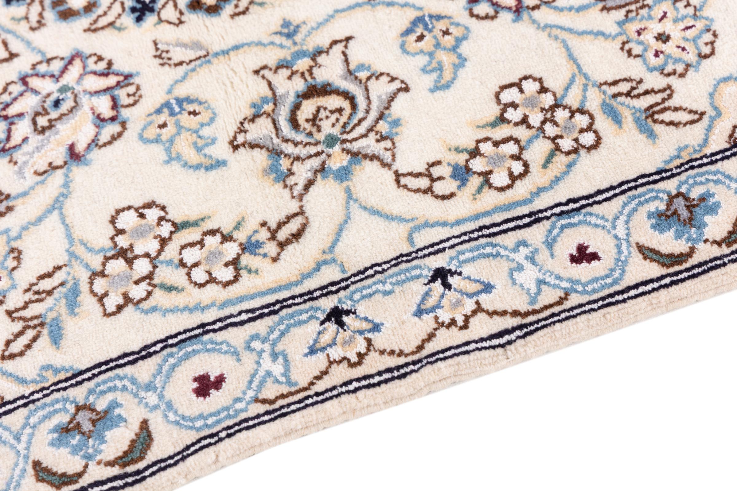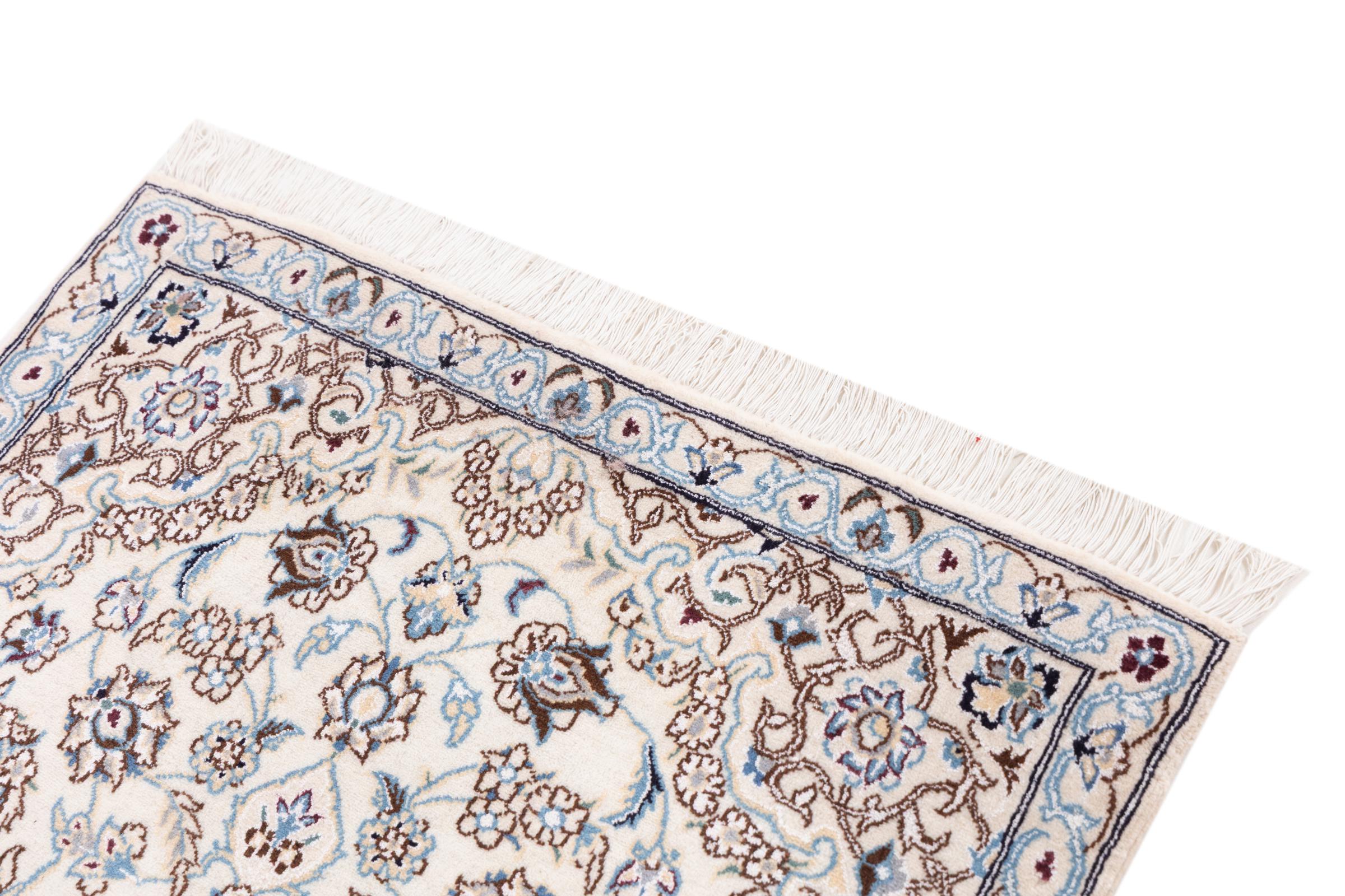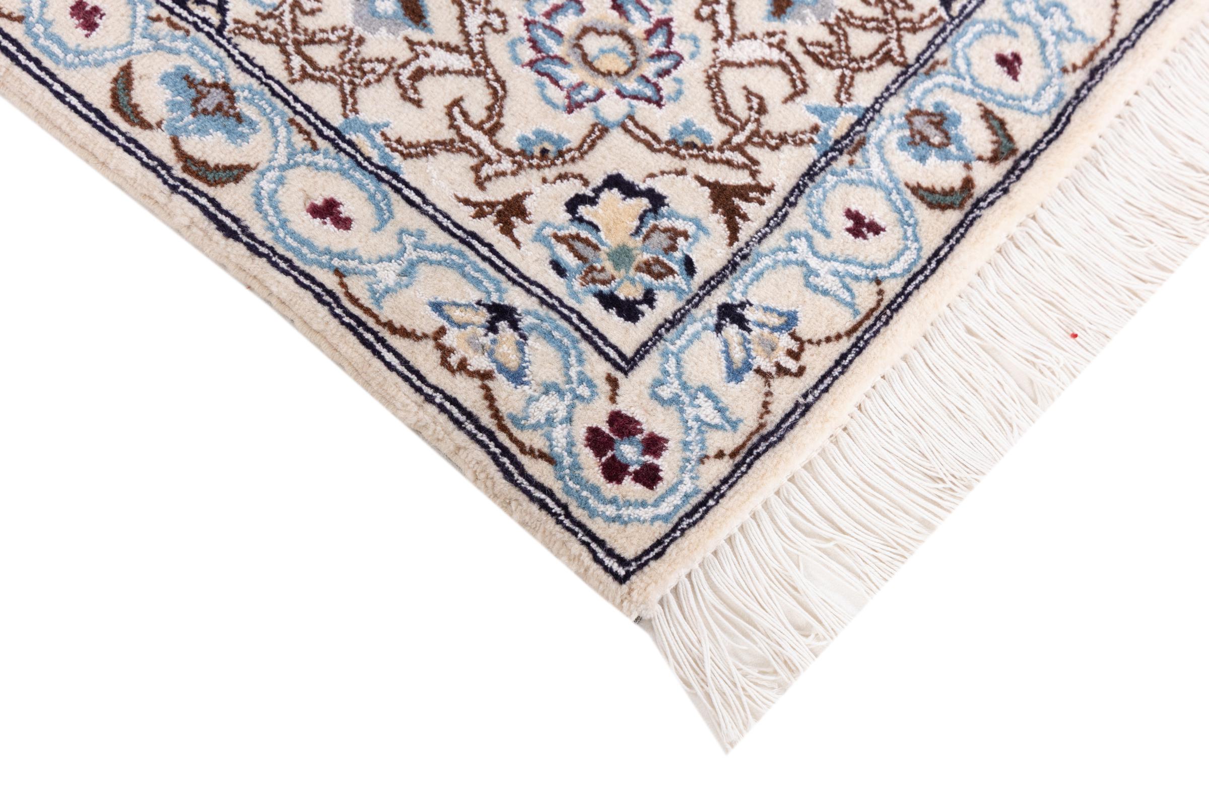 このナインのカーペットは 9La に分類されます。 優れた品質、曲線パターンを備えた美しいオリエンタルなデザインは、すべてのバイヤーを喜ばせます。 このペルシャ絨毯は、ダシュテ・カヴィル砂漠の西端にあるナイン市で高品質のウールと天然シルクを使って手織りされました。 9La Nain は 12La よりもかなり細かく、すでに美しいディテールを示しています。