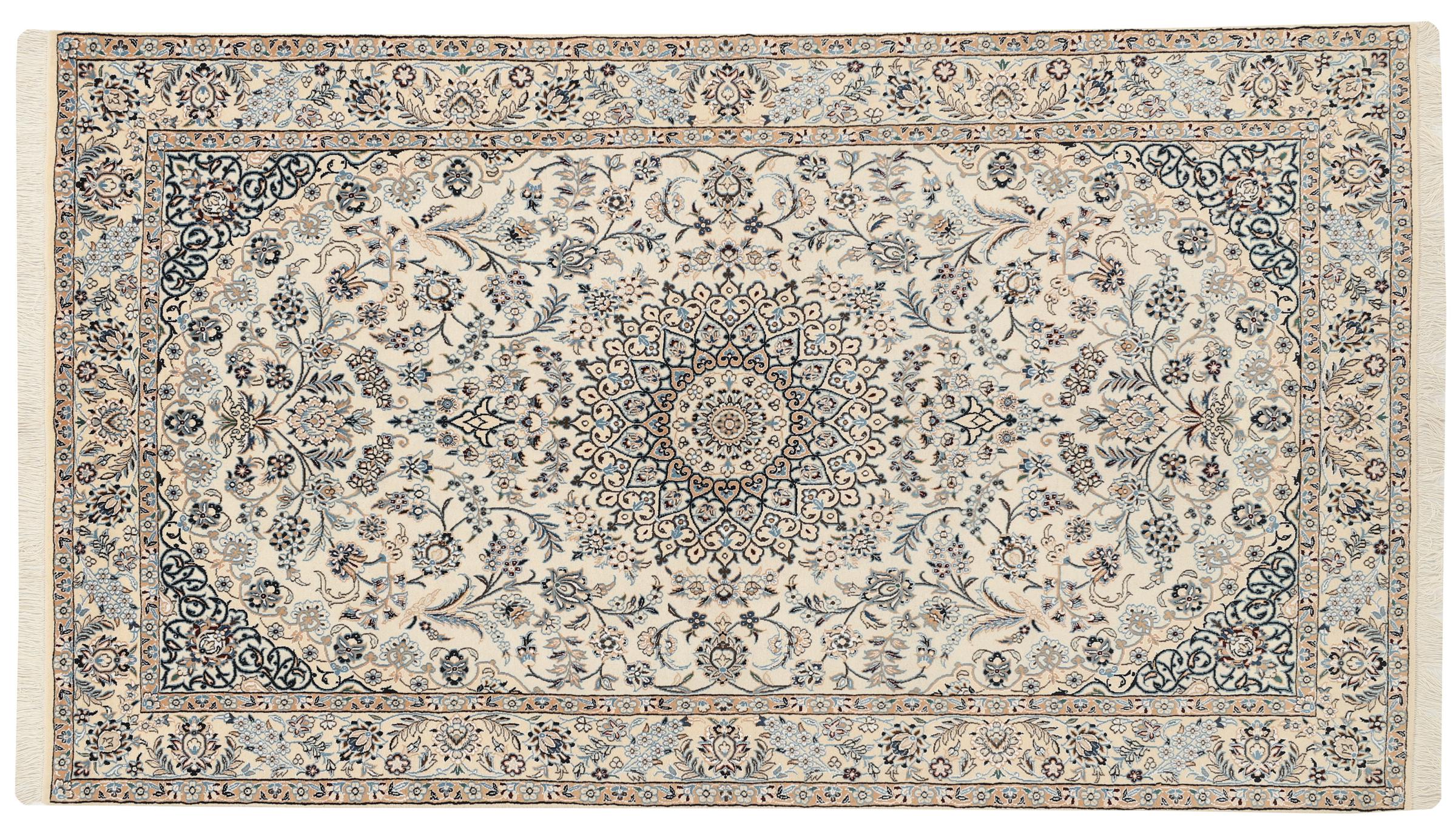 イランで最大の砂漠の1つの国境にあるナイン市のカーペットは、世界で最も有名なペルシャ絨毯の1つです。 彼らの典型的なデザインは、花の装飾品、メダリオン、ベージュと赤または青の色と紛れもないものです。 4La、6La、9La、12Laという名前のおかげで、Nainカーペットの繊細さが一目でわかります。 「ラ」の数値が低いほど、ノット密度が高くなり、カーペットの繊度が高くなります。