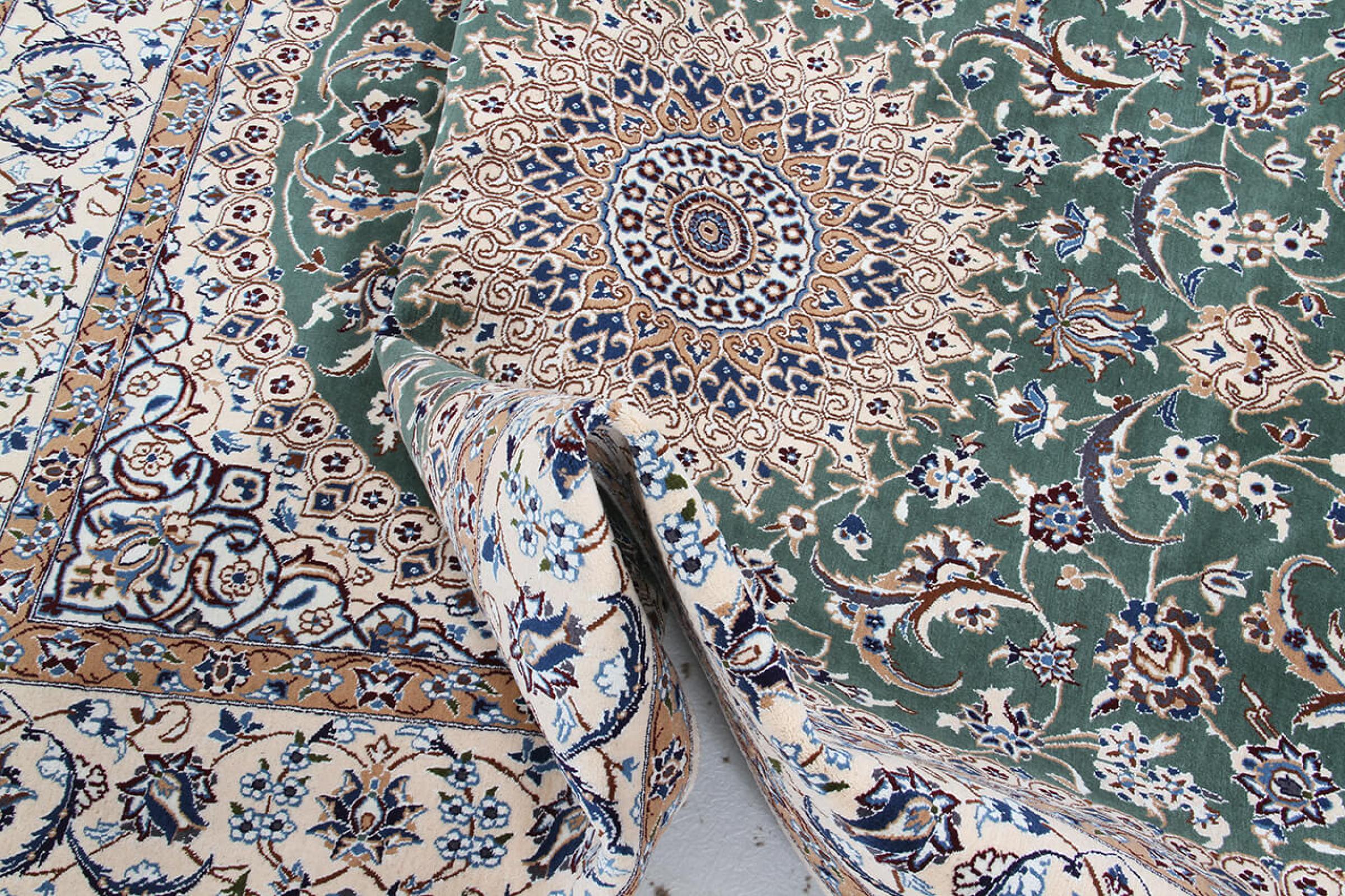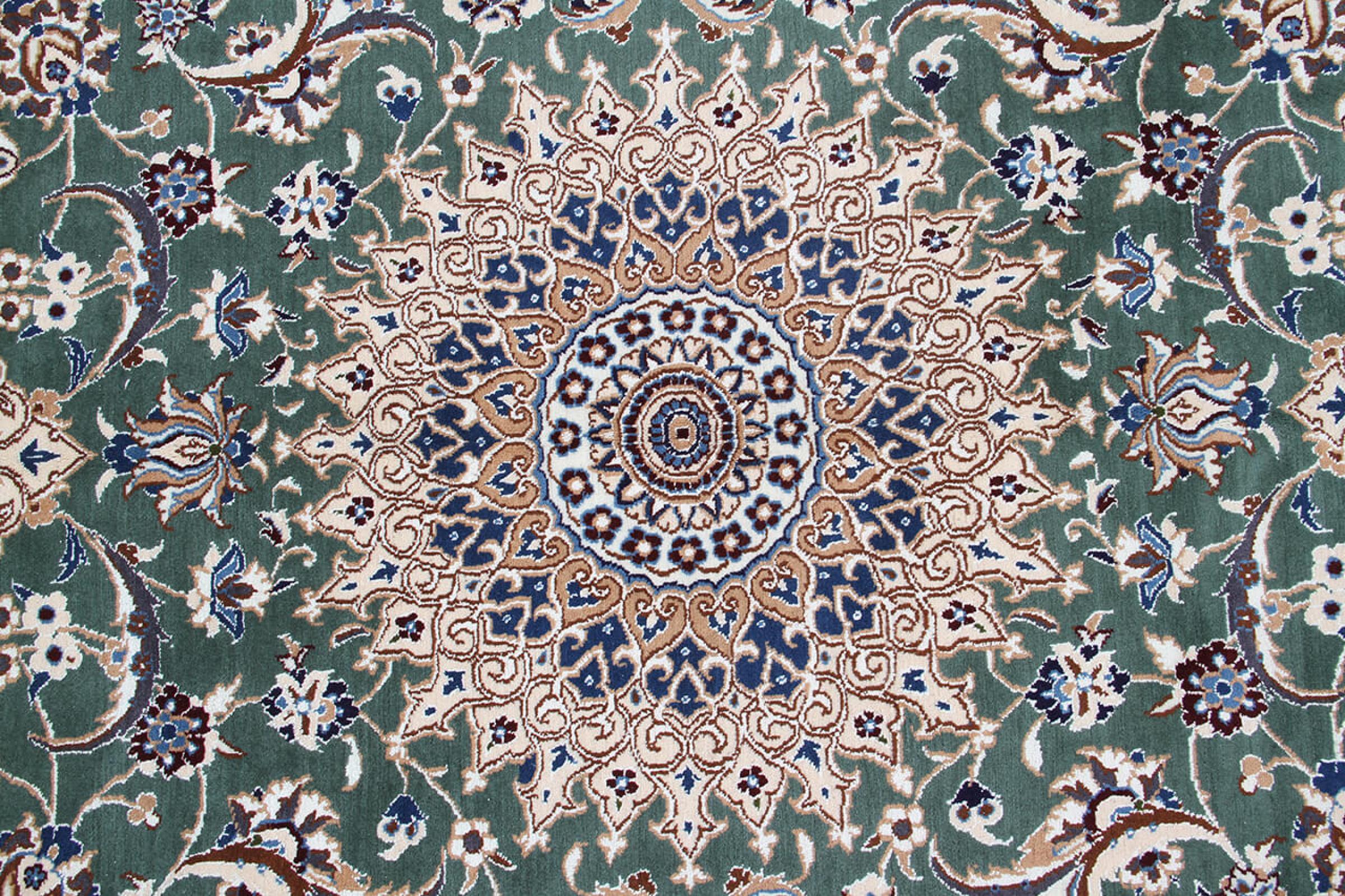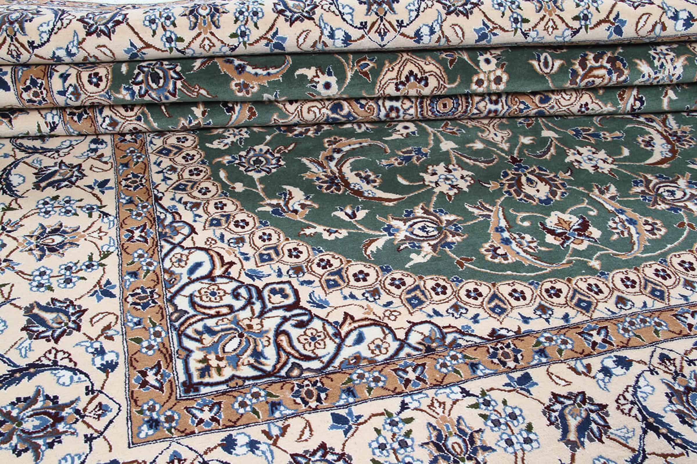 イランで最大の砂漠の1つの国境にあるナイン市のカーペットは、世界で最も有名なペルシャ絨毯の1つです。 彼らの典型的なデザインは、花の装飾品、メダリオン、ベージュと赤または青の色と紛れもないものです。 4La、6La、9La、12Laという名前のおかげで、Nainカーペットの繊細さが一目でわかります。 「ラ」の数値が低いほど、ノット密度が高くなり、カーペットの繊度が高くなります。