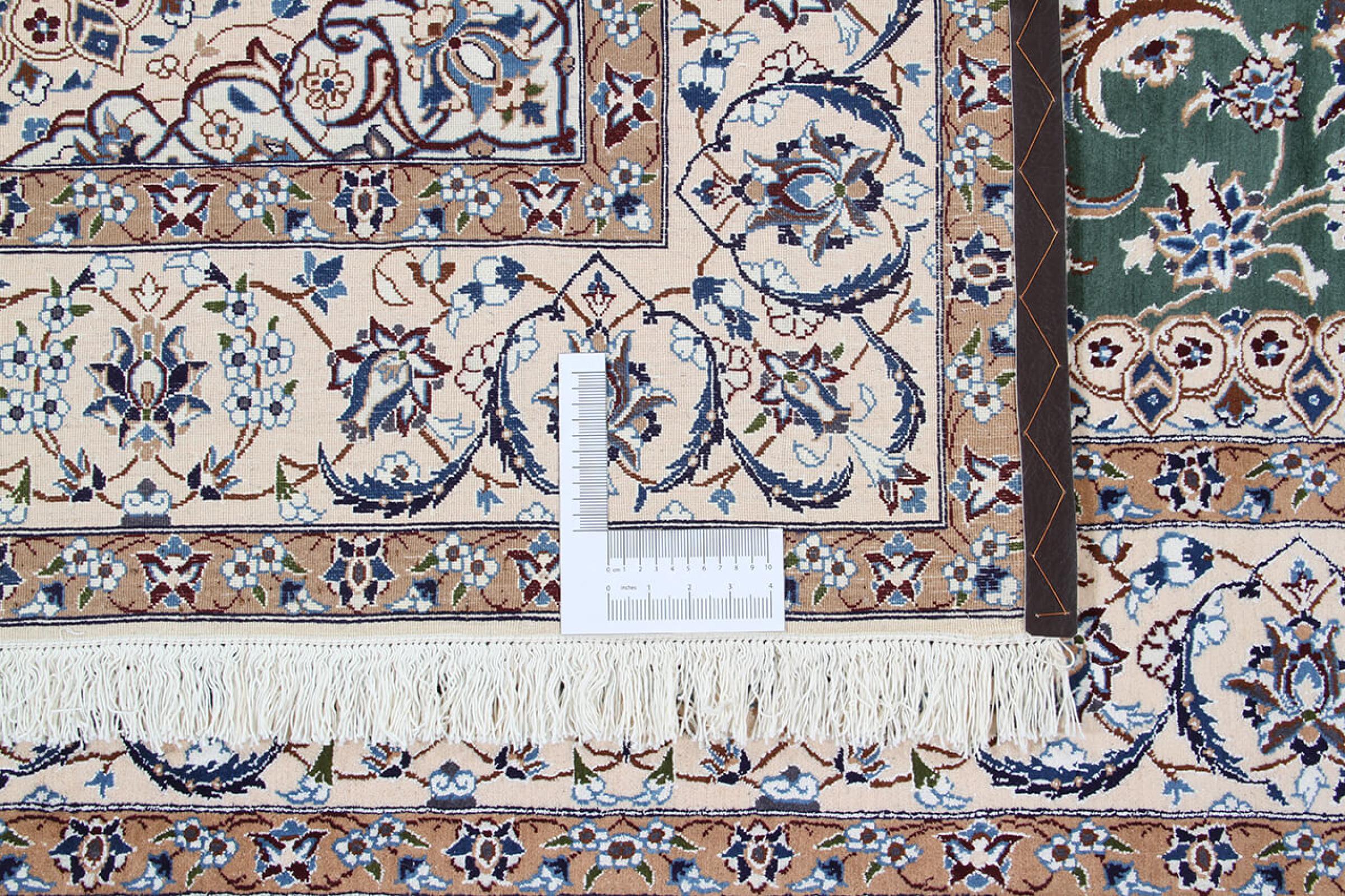 このナインのカーペットは 9La に分類されます。 優れた品質、曲線パターンを備えた美しいオリエンタルなデザインは、すべてのバイヤーを喜ばせます。 このペルシャ絨毯は、ダシュテ・カヴィル砂漠の西端にあるナイン市で高品質のウールと天然シルクを使って手織りされました。 9La Nain は 12La よりもかなり細かく、すでに美しいディテールを示しています。