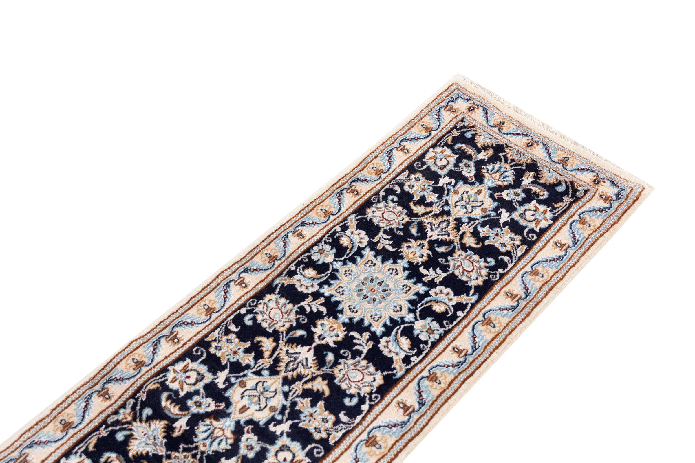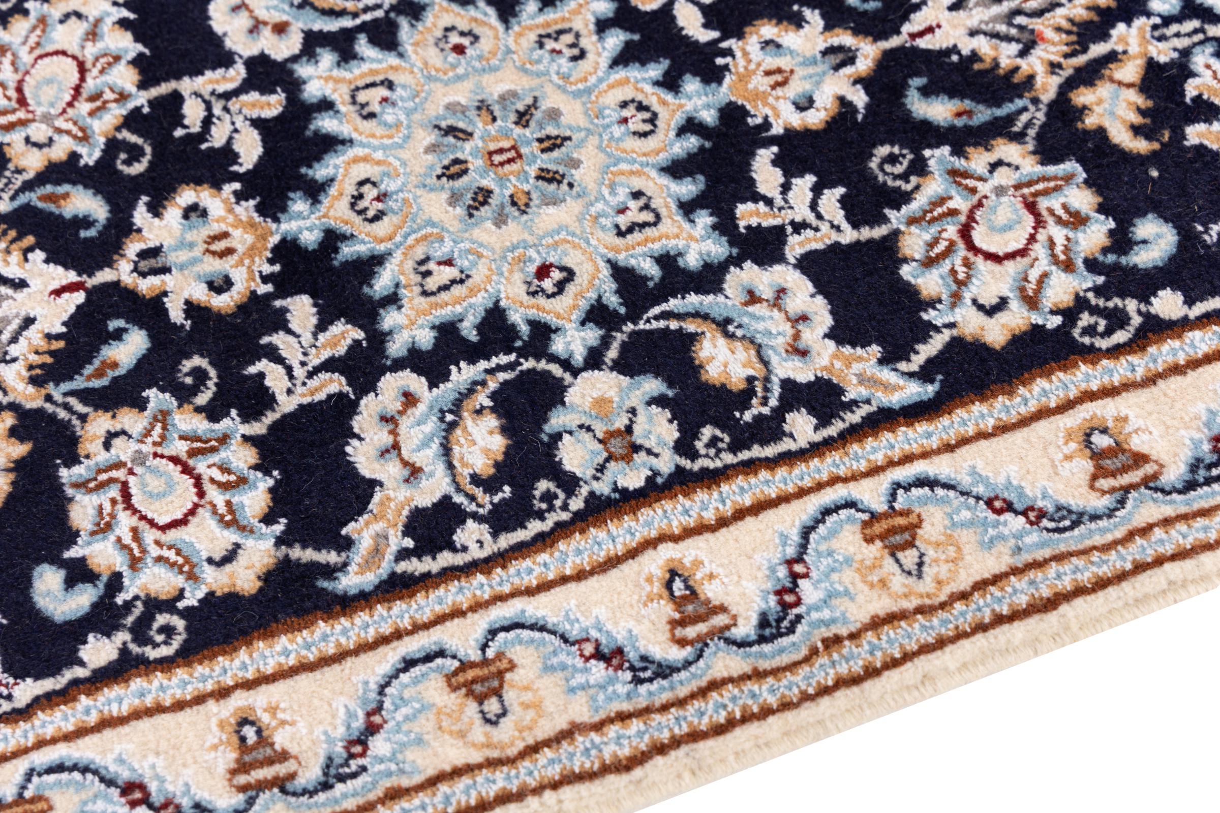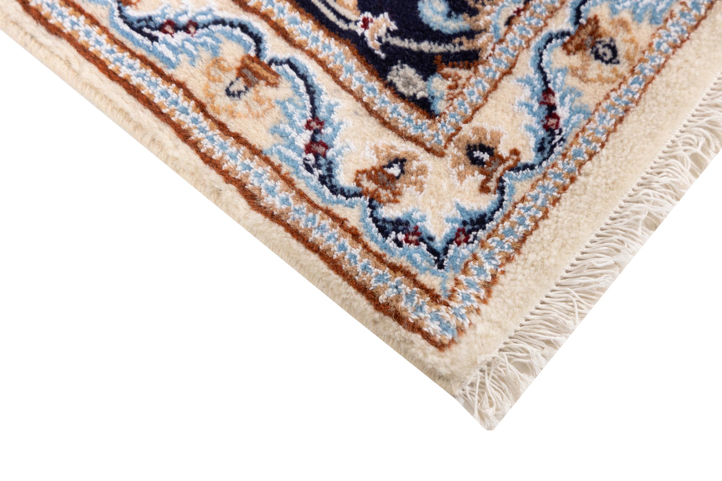 このナインのカーペットは 9La に分類されます。 優れた品質、曲線パターンを備えた美しいオリエンタルなデザインは、すべてのバイヤーを喜ばせます。 このペルシャ絨毯は、ダシュテ・カヴィル砂漠の西端にあるナイン市で高品質のウールと天然シルクを使って手織りされました。 9La Nain は 12La よりもかなり細かく、すでに美しいディテールを示しています。