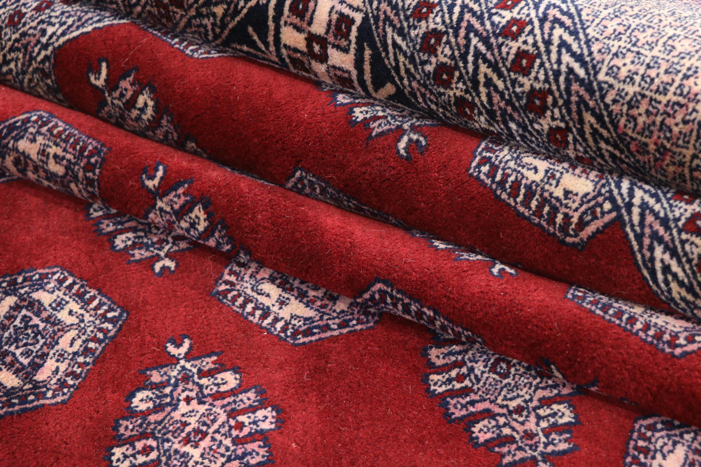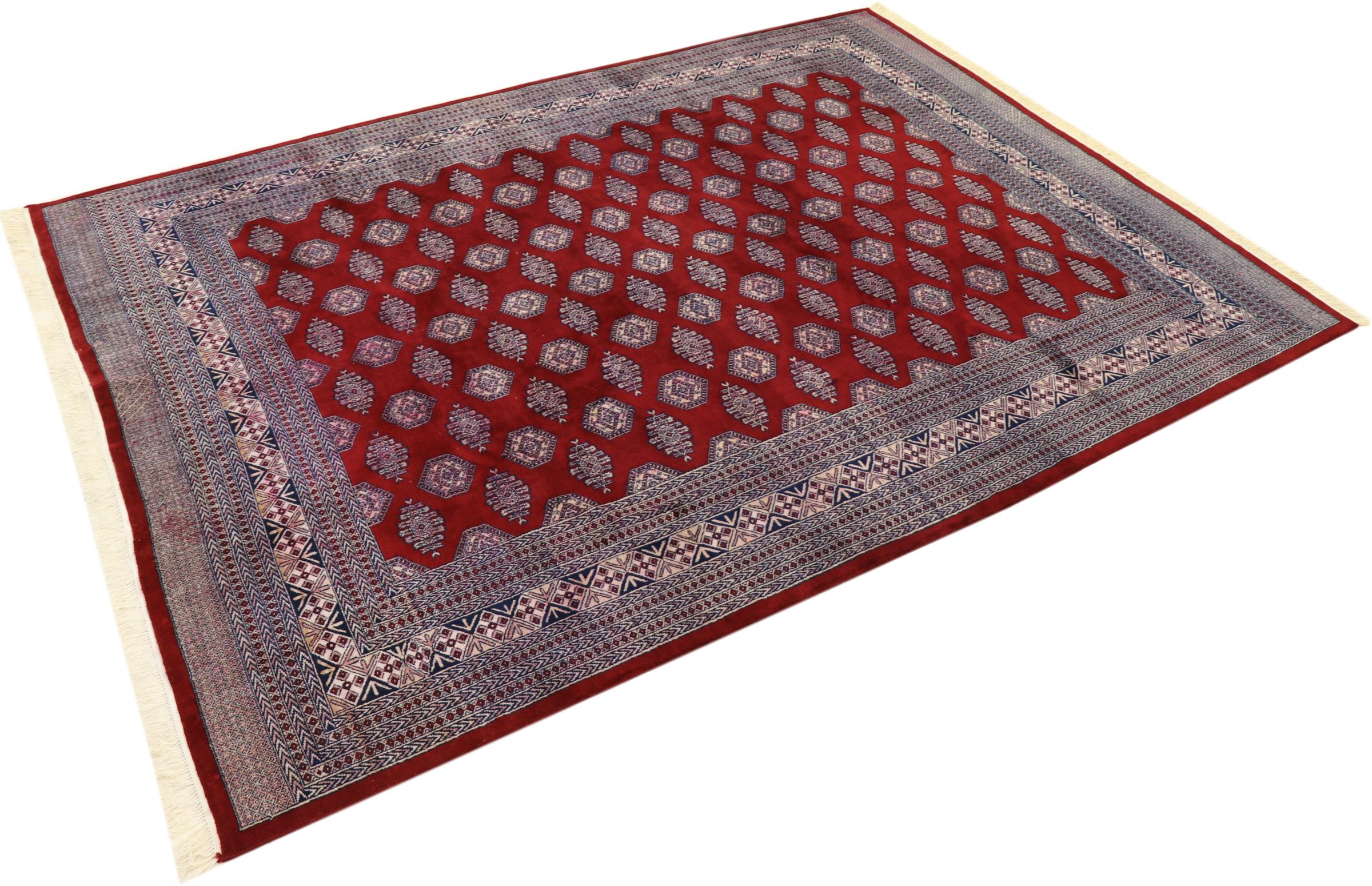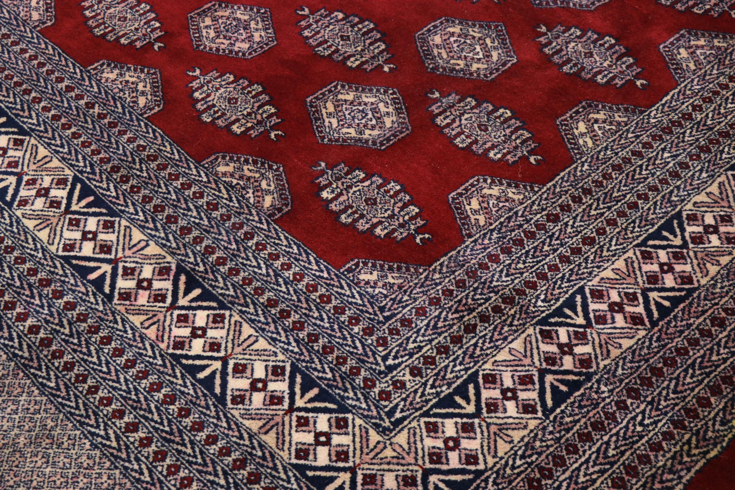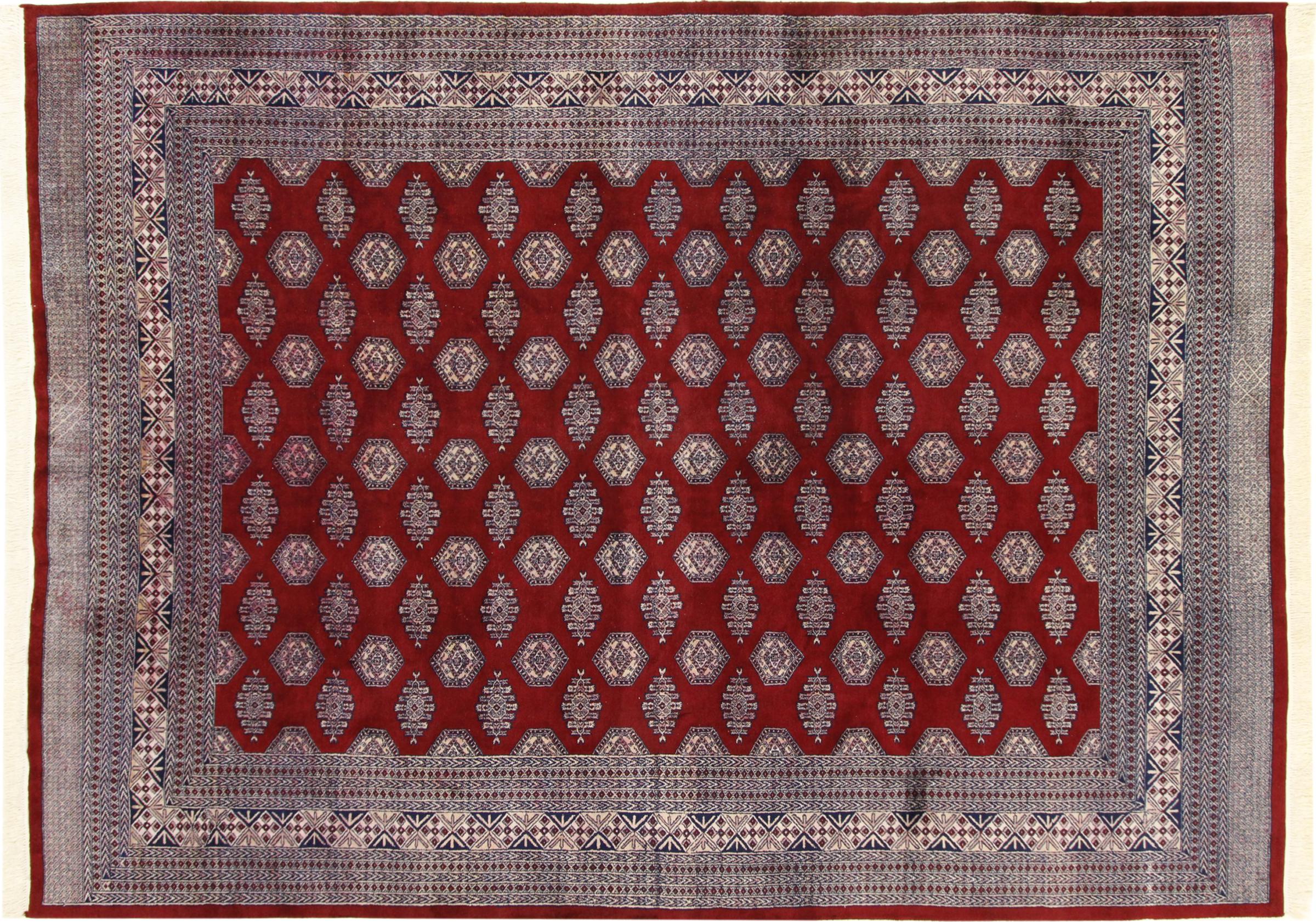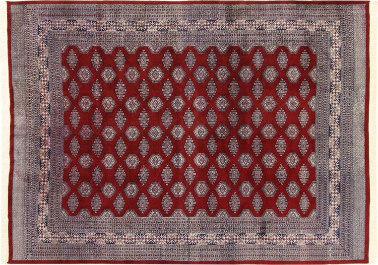 パキスタンのカーペット生産の大部分は、ラホールとカラチの都市とその周辺で行われています。当時の絨毯織り職人の多くは、インドとの戦争中にパキスタンに逃れて定住しました。今日では、特に手織りのパキスタンのブハラ絨毯が知られています。 アフガニスタンのオリエンタルカーペットと同様に、パキスタンのカーペットもダークカラーで、ほとんどが赤を基調としています。また、よく知られている象足柄(八角形を繰り返す柄)もパキスタンでは見られます。