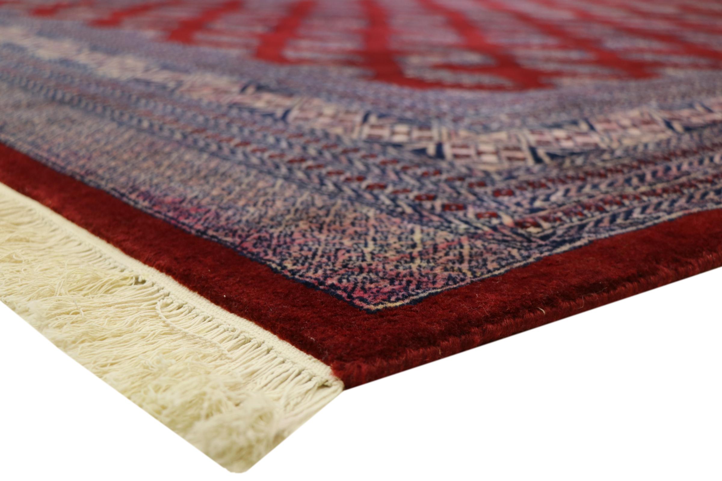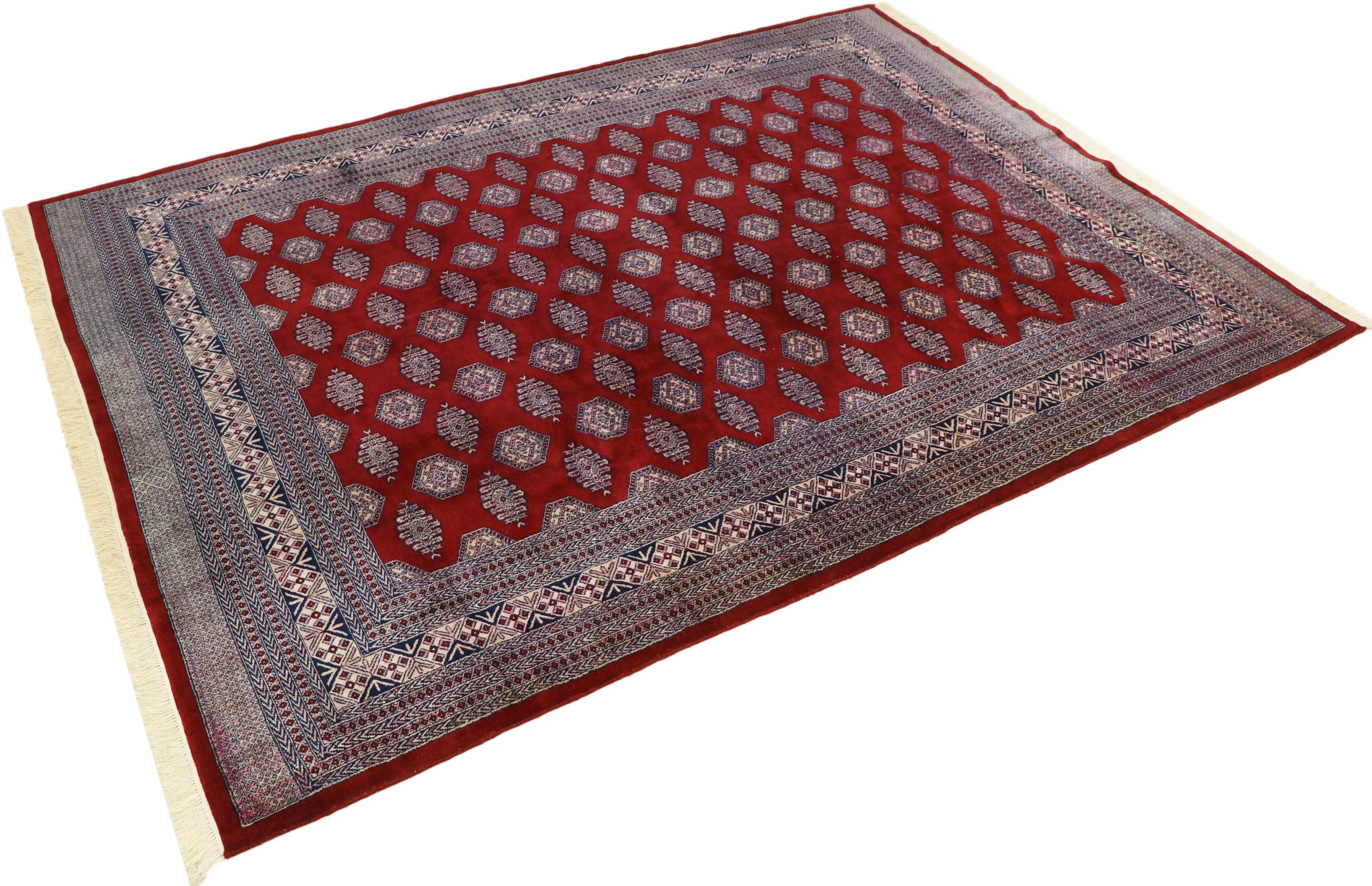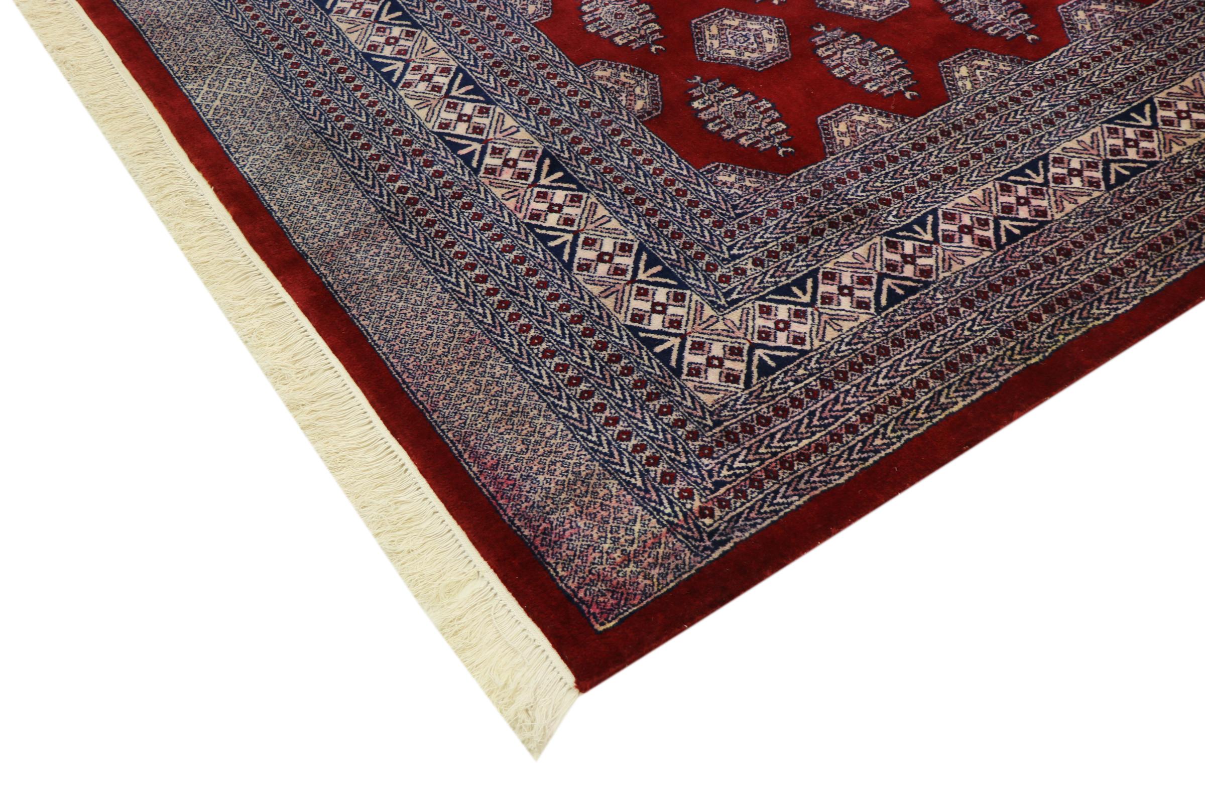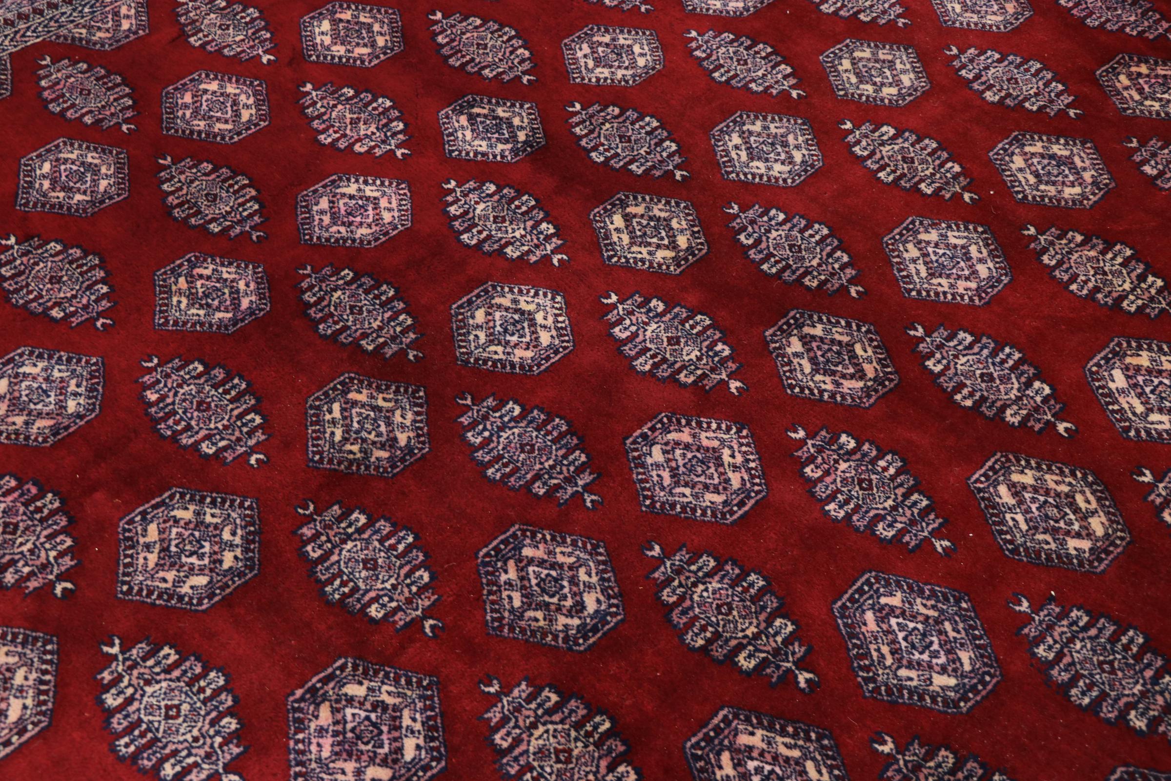 パキスタンのカーペット生産の大部分は、ラホールとカラチの都市とその周辺で行われています。当時の絨毯織り職人の多くは、インドとの戦争中にパキスタンに逃れて定住しました。今日では、特に手織りのパキスタンのブハラ絨毯が知られています。 アフガニスタンのオリエンタルカーペットと同様に、パキスタンのカーペットもダークカラーで、ほとんどが赤を基調としています。また、よく知られている象足柄(八角形を繰り返す柄)もパキスタンでは見られます。