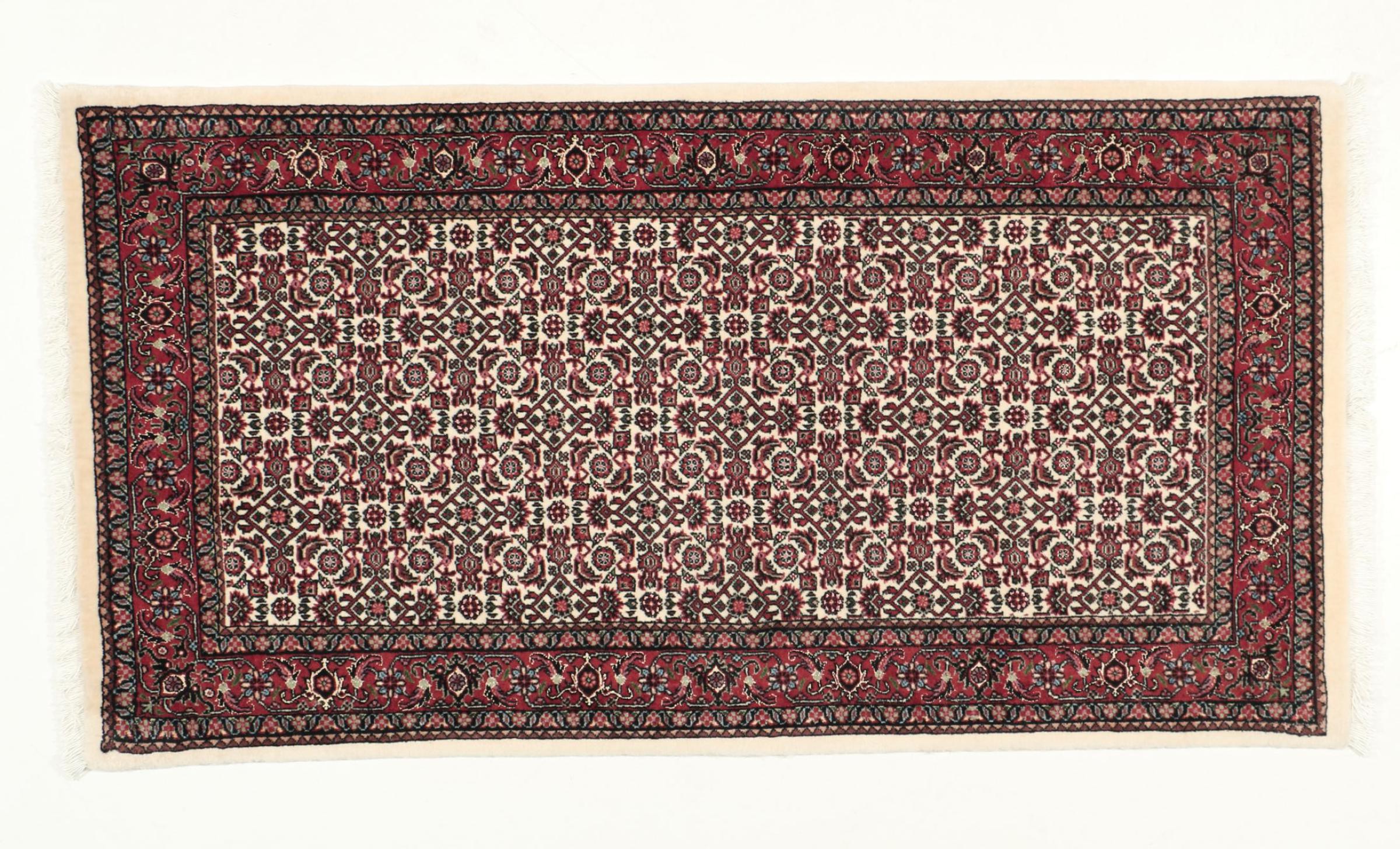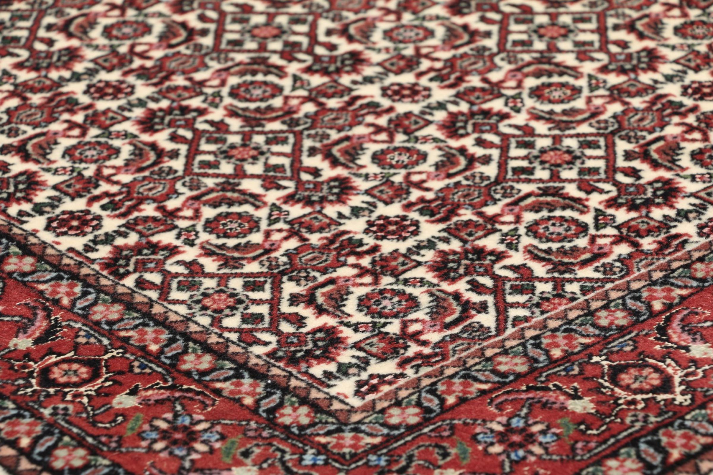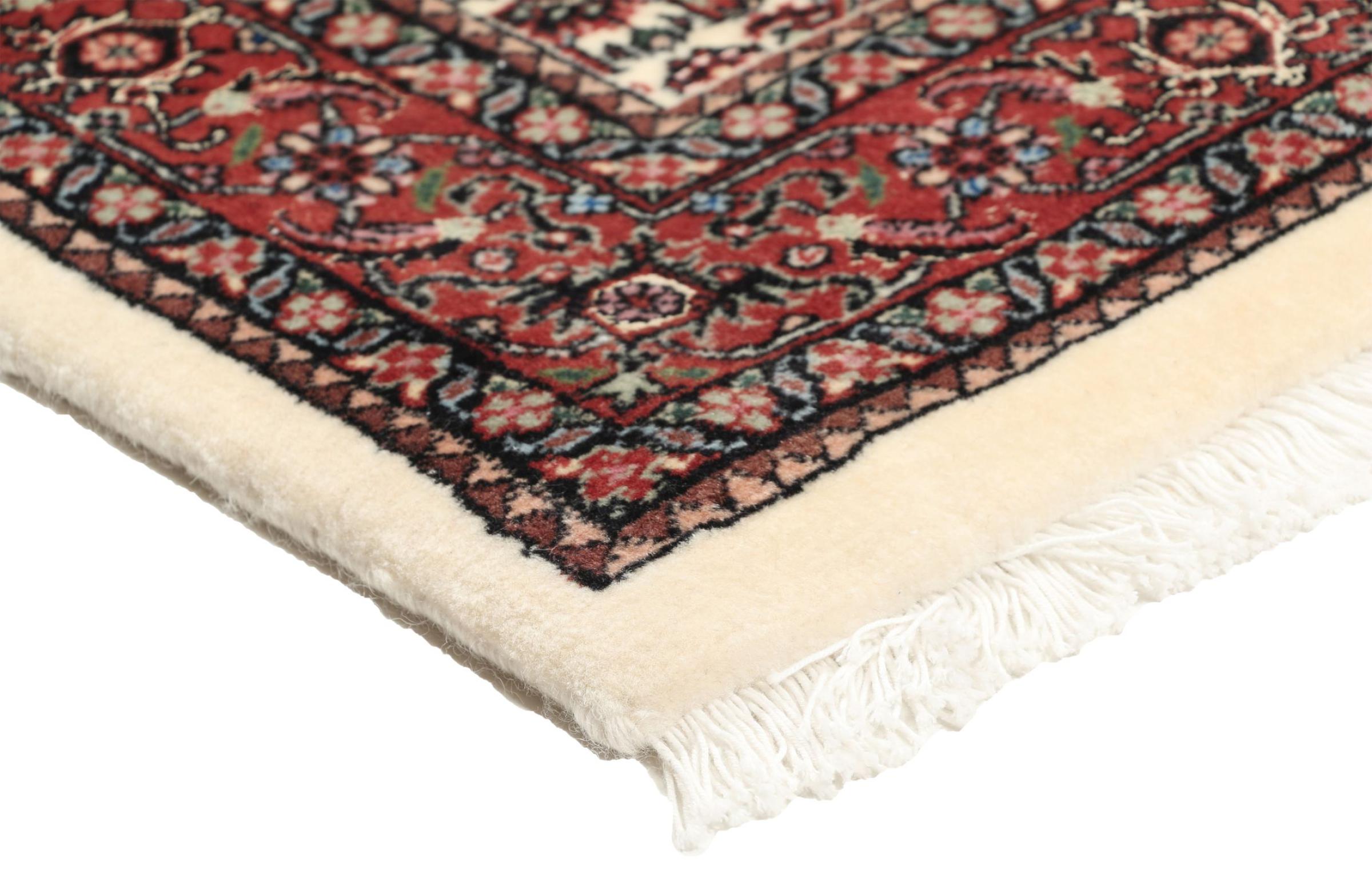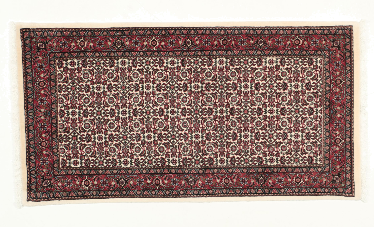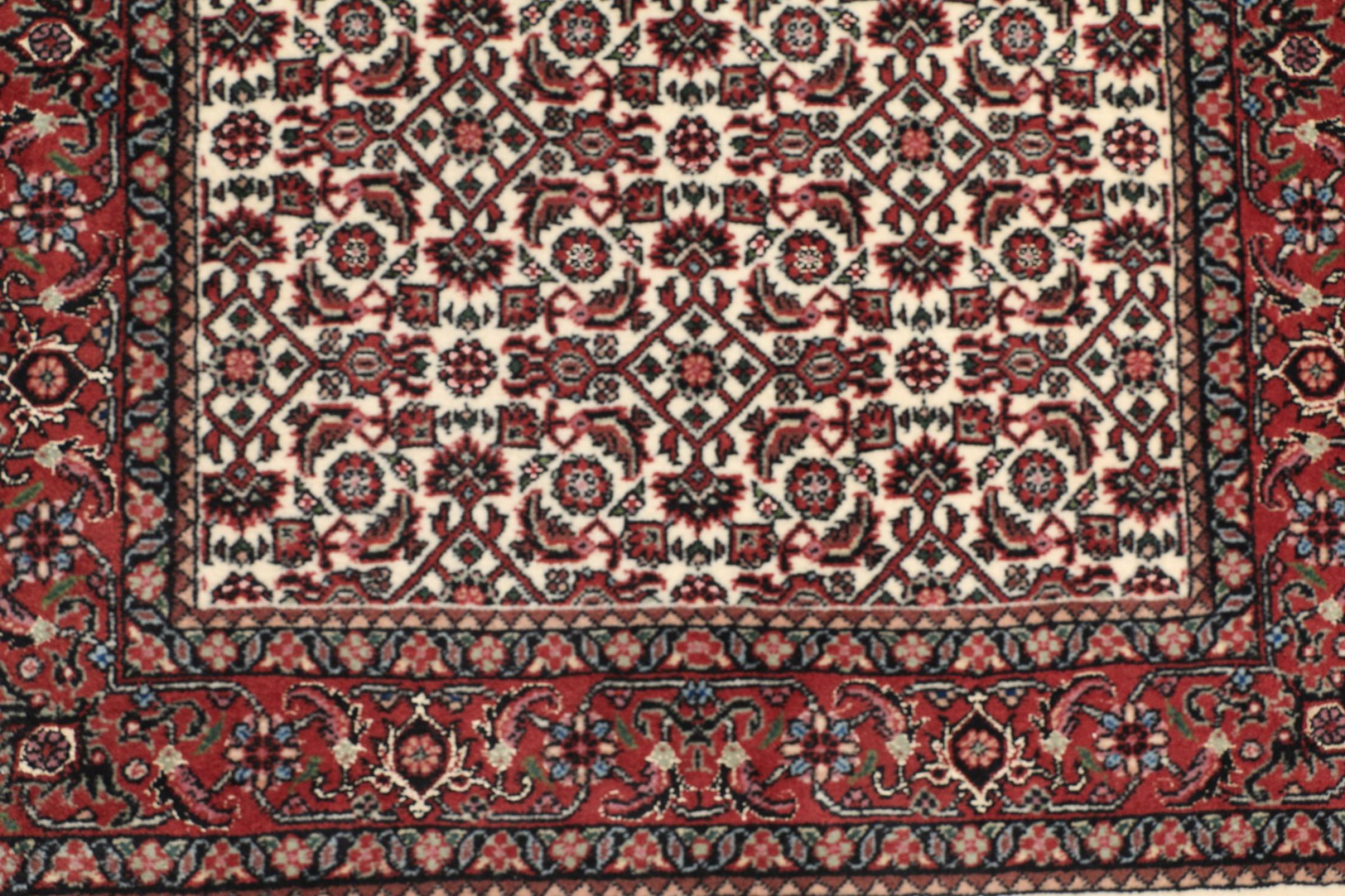 このペルシャ絨毯は、イラン西部のクルド人の小さな町で手織りされたものです。ビジャールカーペットは優れた品質を表しています。しっかりとしたパイルはそのコンパクトさ、したがって耐摩耗性に優れています。ウールは櫛でしっかりと圧縮されているため、パイルはほぼ垂直に上向きに立っています。これは、大きな汚れ粒子が浸透する可能性がほとんどないことを意味します。
