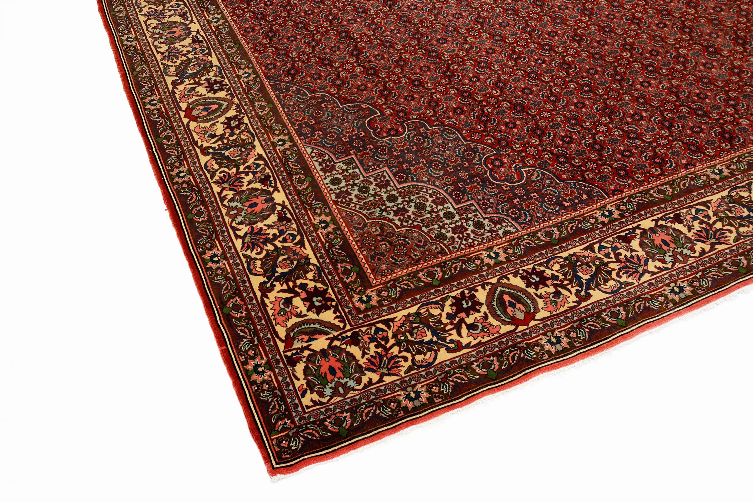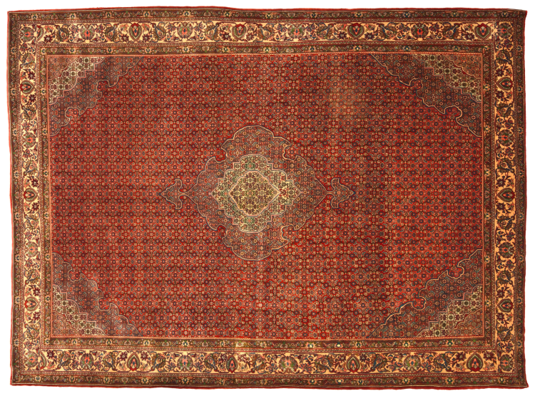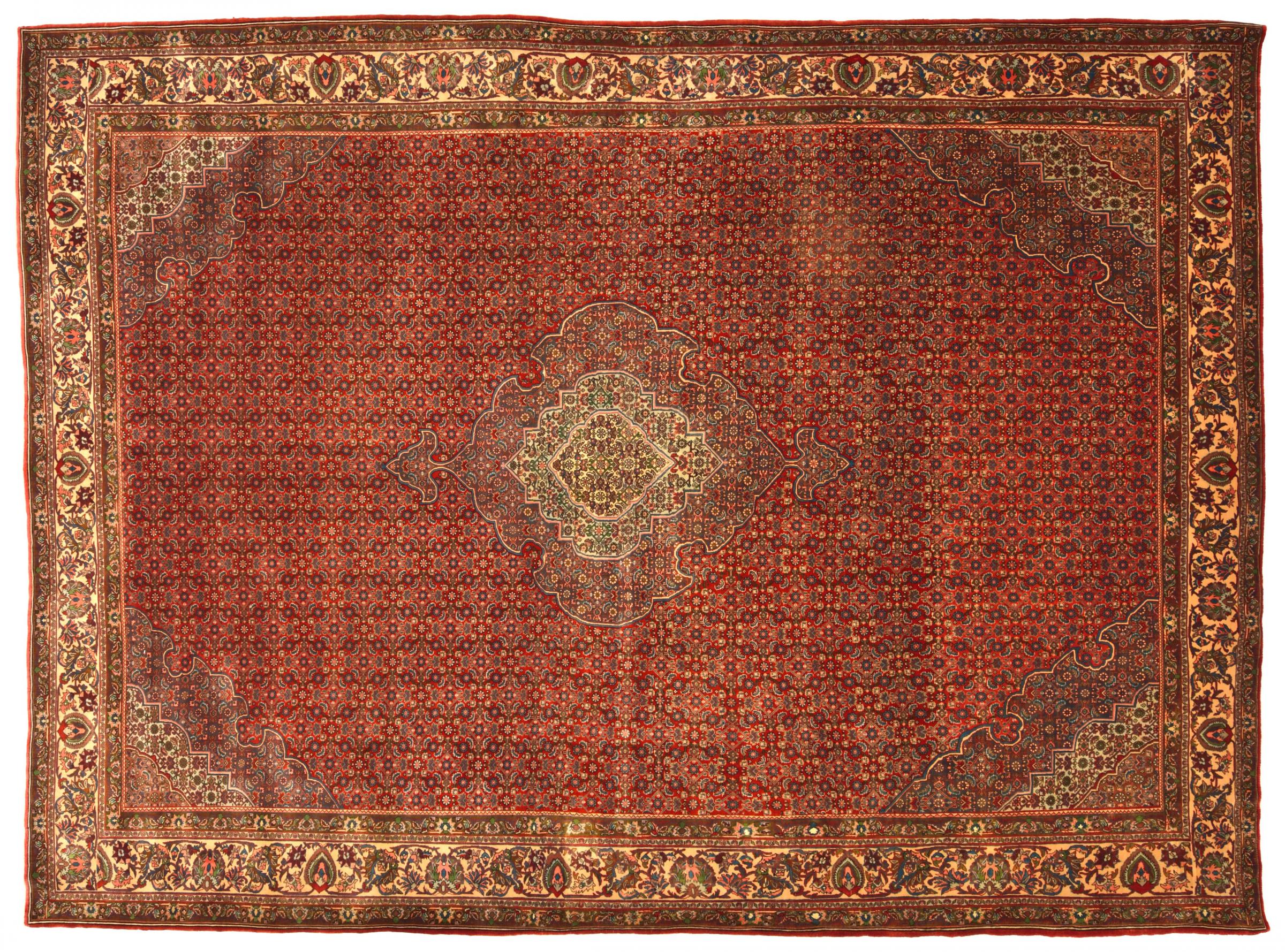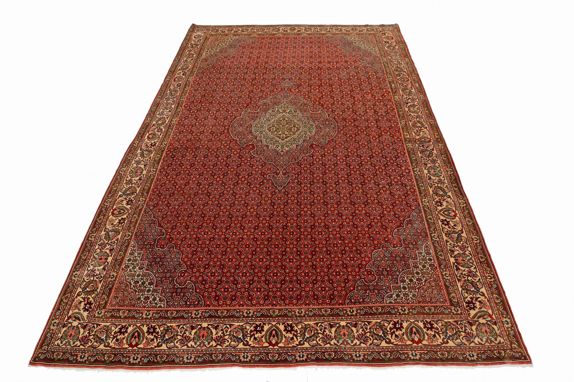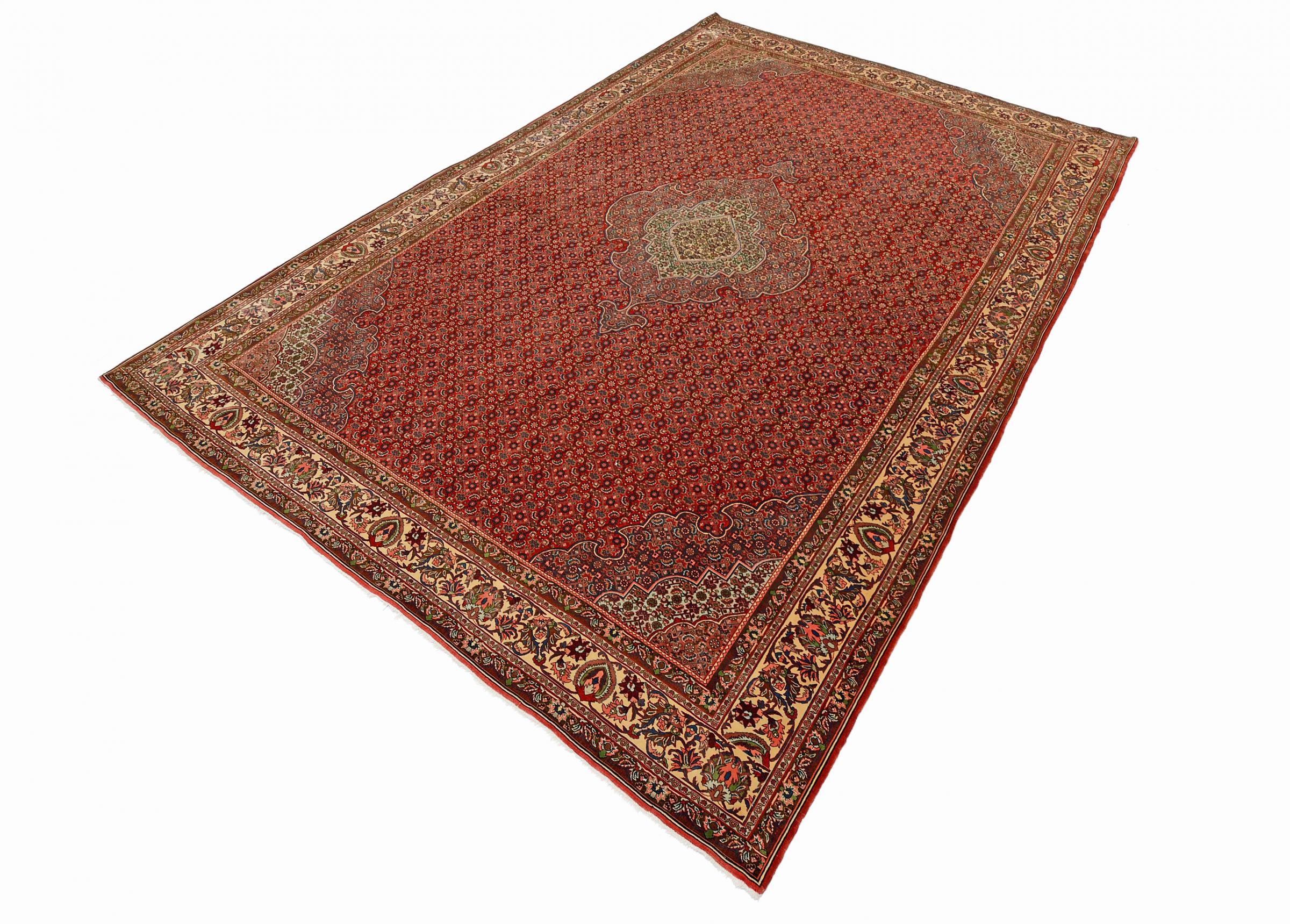 このペルシャ絨毯は、イラン西部のクルド人の小さな町で手織りされたものです。ビジャールカーペットは優れた品質を表しています。しっかりとしたパイルはそのコンパクトさ、したがって耐摩耗性に優れています。ウールは櫛でしっかりと圧縮されているため、パイルはほぼ垂直に上向きに立っています。これは、大きな汚れ粒子が浸透する可能性がほとんどないことを意味します。