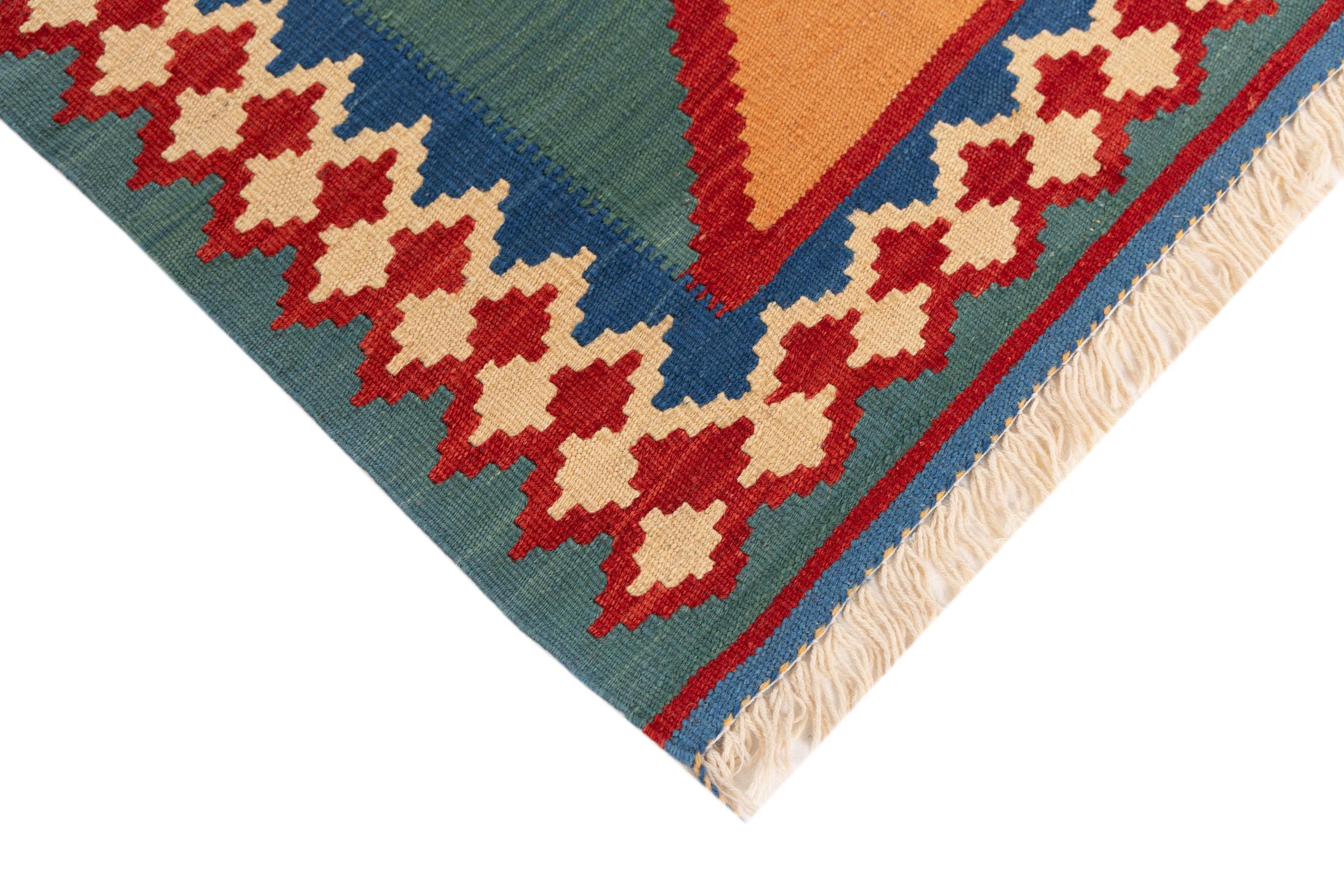 この絨毯は、平織りとして織機で手作業で作られたものです。フラットウィーブとは、パイルのないカーペットを指す言葉です。その名の通り、この絨毯は織られていて、結び目はありません。これにより、表面が構造化されたフラットカーペットが得られる。平織りは、結び目のあるカーペットよりも柔らかくなく、通常は薄くなります。同時に、彼らは製造するためにはるかに複雑ではなく、通常は両側(表と裏)からレイアウトすることができます。彼らのパターンは通常、生地によって決定される幾何学的なものです。