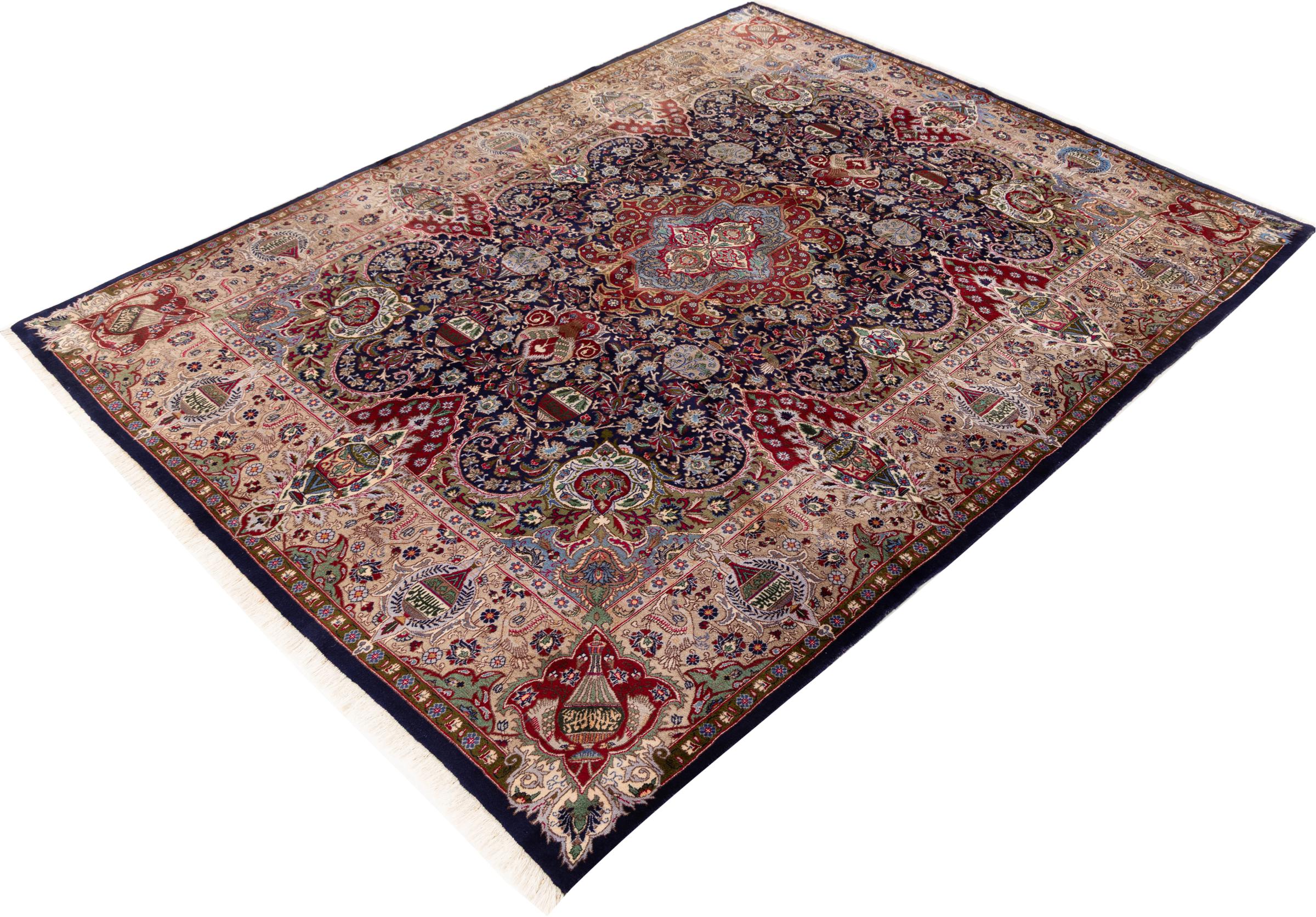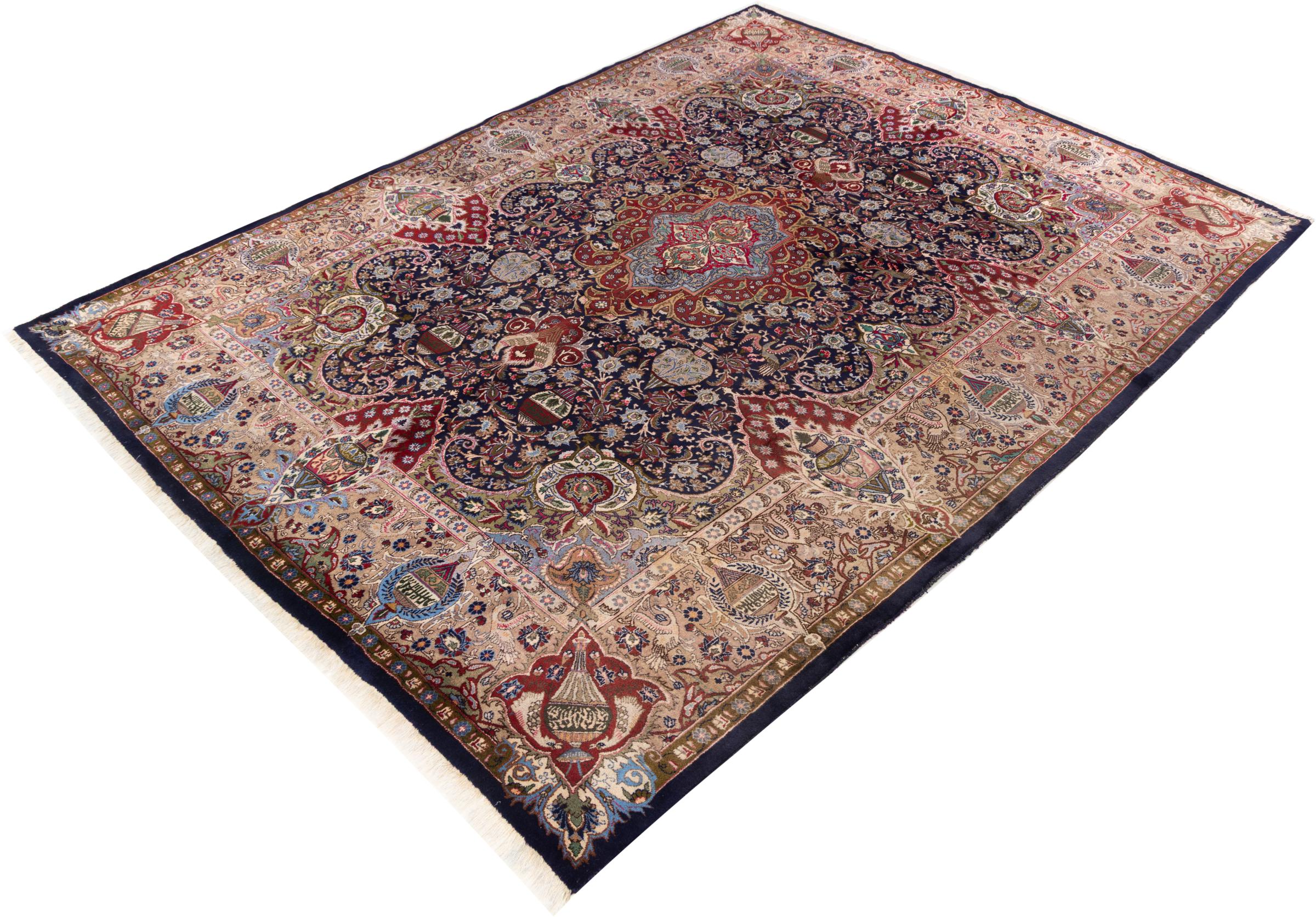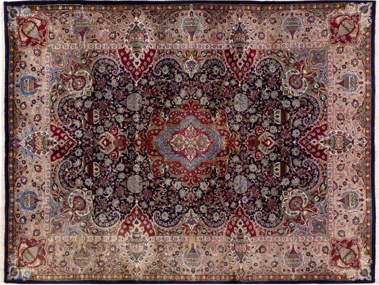この絨毯はイラン(旧ペルシャ)が原産で、ペルシャ絨毯として、手織りの絨毯の中ではおそらく最も高い評価を得ています。イランほど絨毯結びの長い伝統を誇る地域は他にありません。だから、おそらく最高級で精巧な絨毯がここに来るんですね。ペルシャ結びの堅牢性、耐久性、品質は、現在でも他の追随を許しません。 ペルシャ絨毯は通常、産地にちなんだ名前が付けられています。このように、ナイン、ゴーム、イスファハンの絨毯はイランの同名の都市に由来しています。