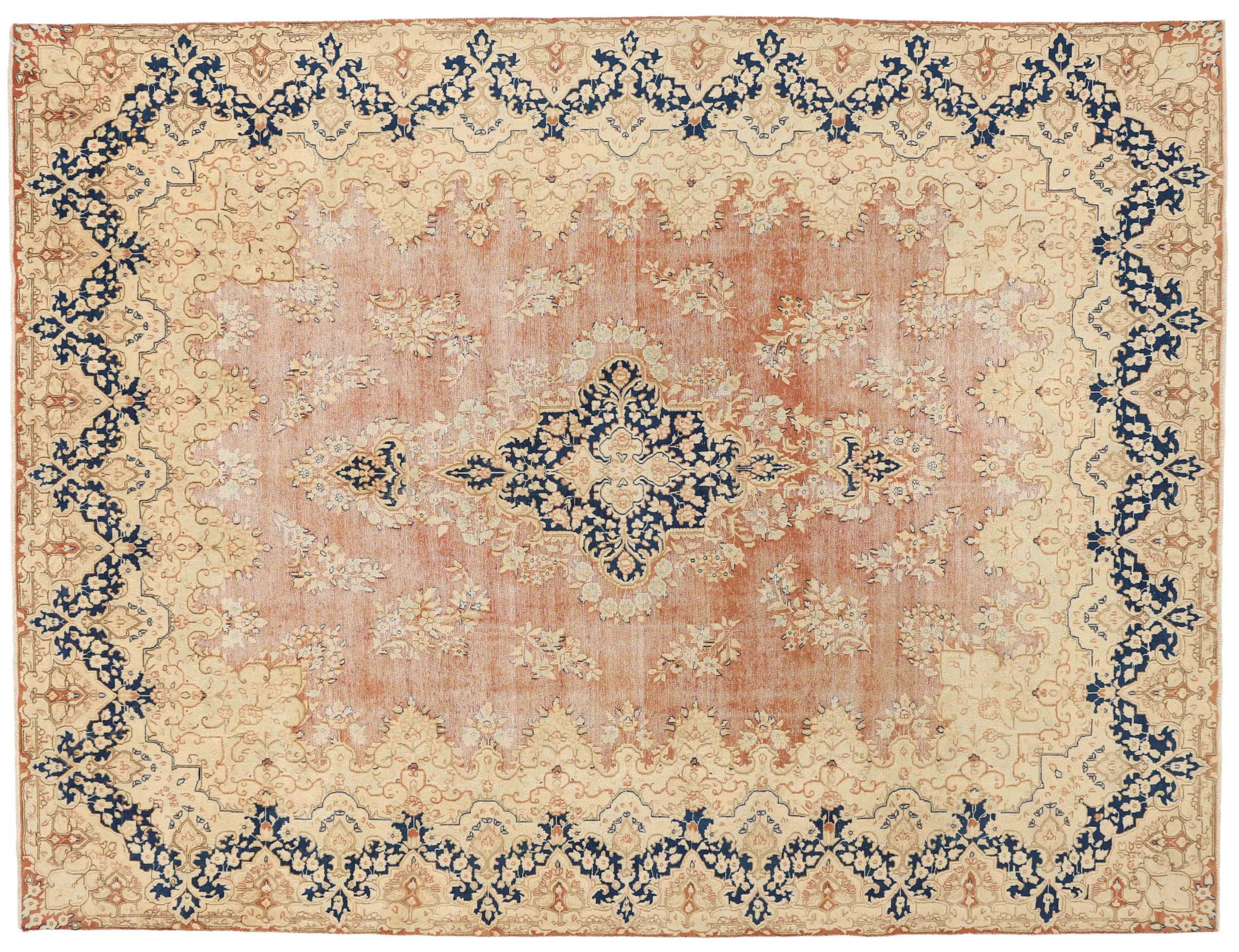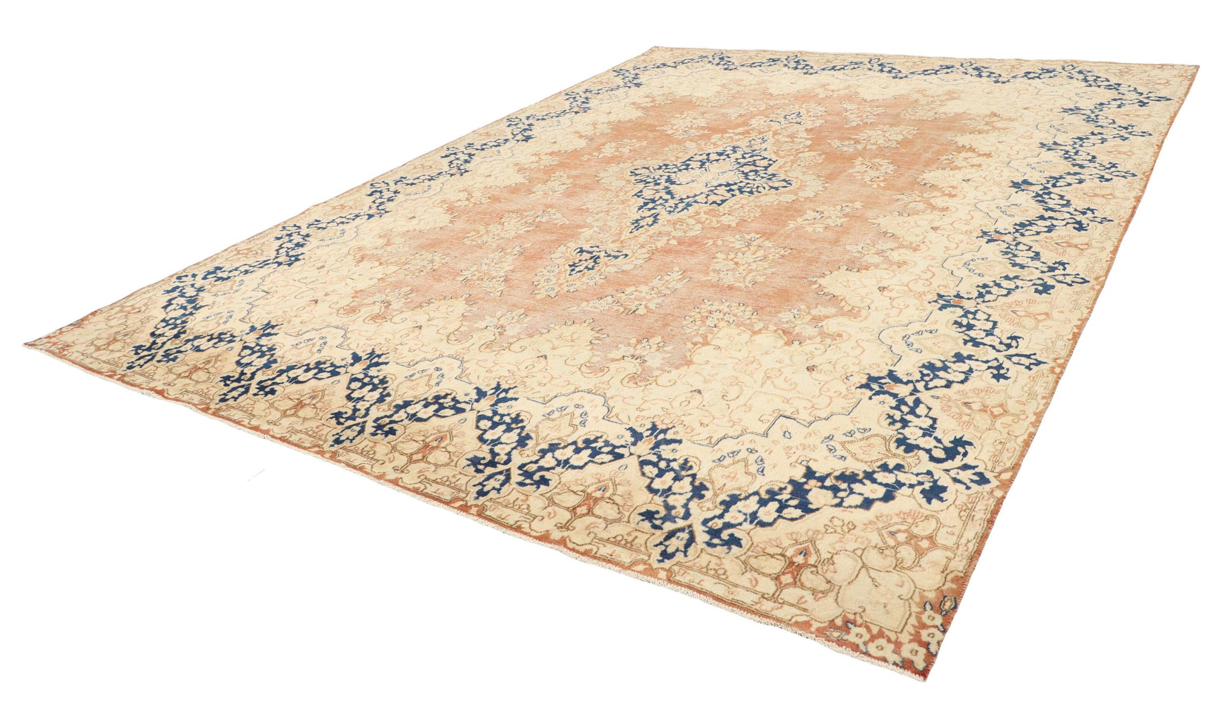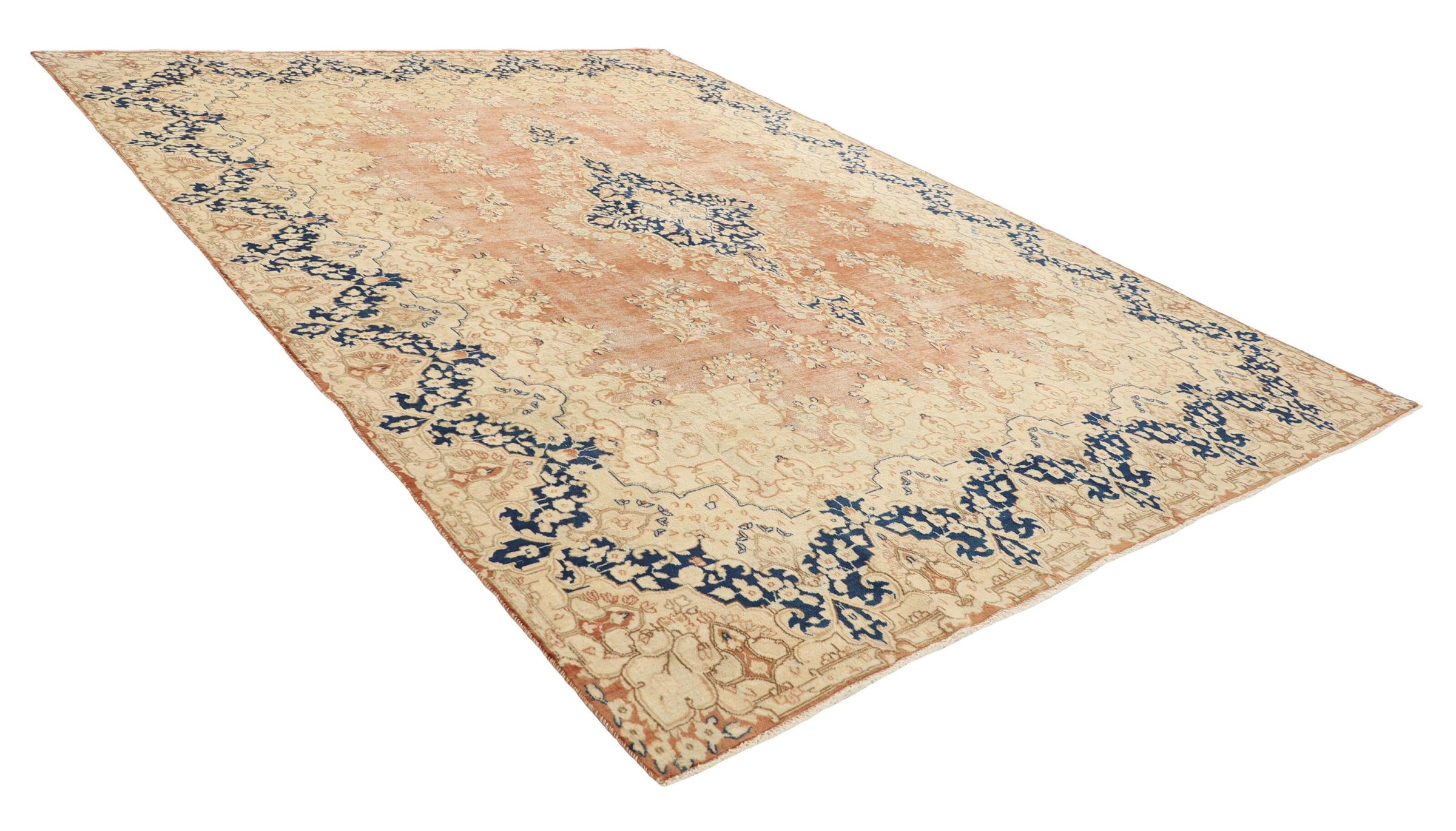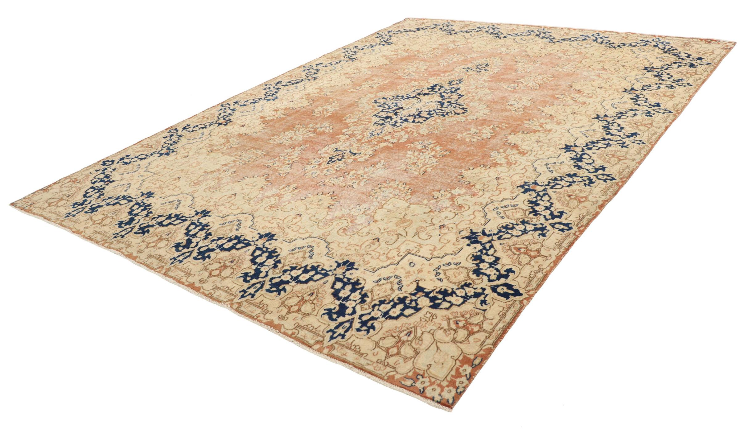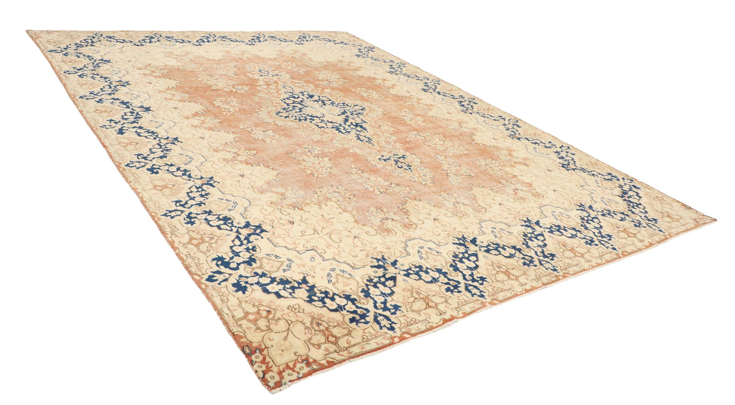 このようなヴィンテージのペルシャ絨毯は、間違いなくヴィンテージ絨毯の中でもハイライトです。 このカーペットは、世界で最も高く評価されている織物の産地の 1 つであるペルシャの都市ケルマーンで生産されています。 花の装飾、中央のメダリオン、そして非常に高品質のおかげで、ケルマーンのペルシャ絨毯は世界中で人気があります。 このヴィンテージ ケルマンもこれらの価値観に基づいています。 羊毛のパイルは平らに整えられ、専門的に再加工されています。 オリジナルのパターンや装飾は意図的に保存されています。 同時に、輪郭の色が変更され、エレガントなヴィンテージの外観が強調されました。