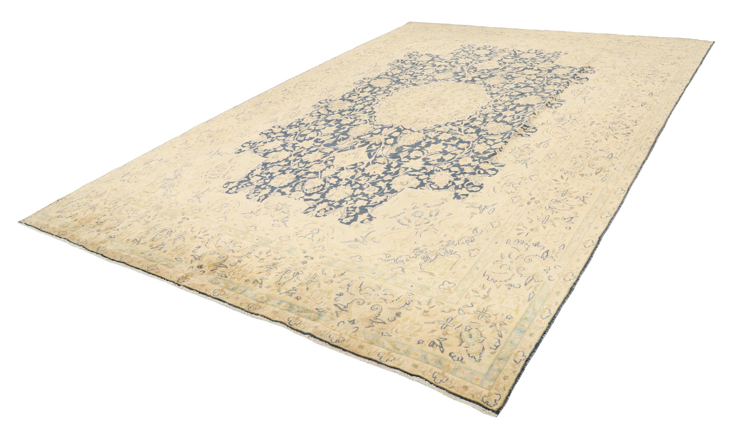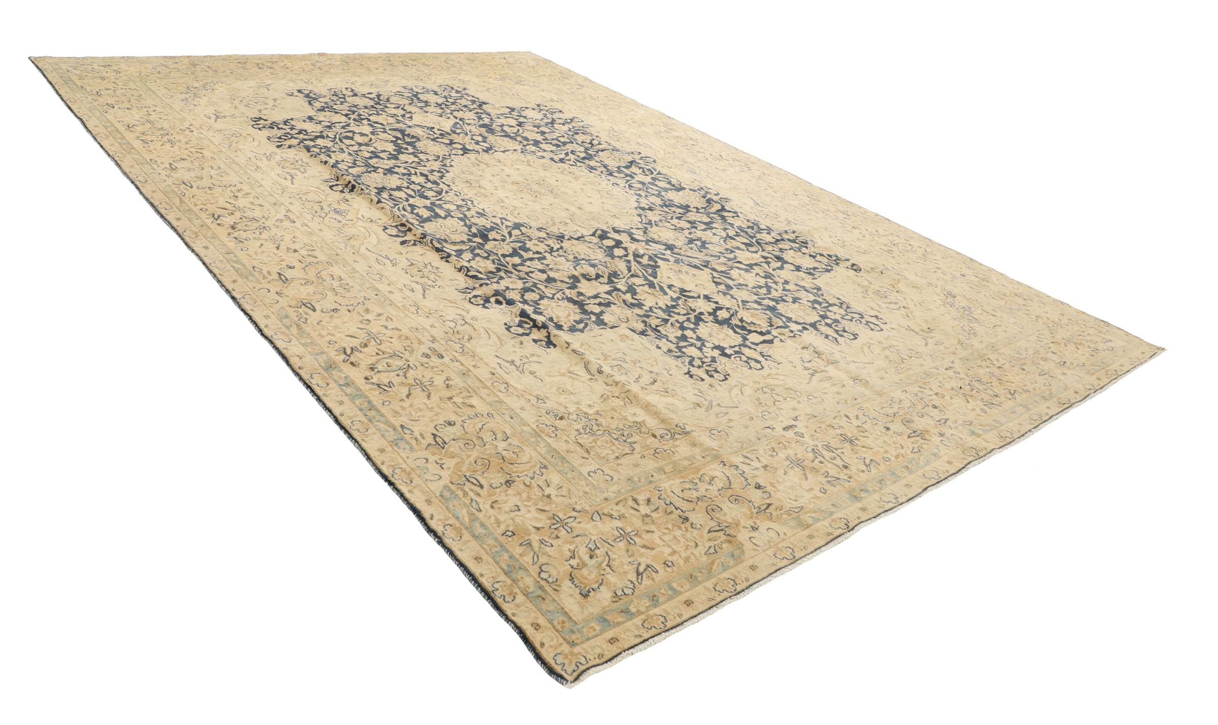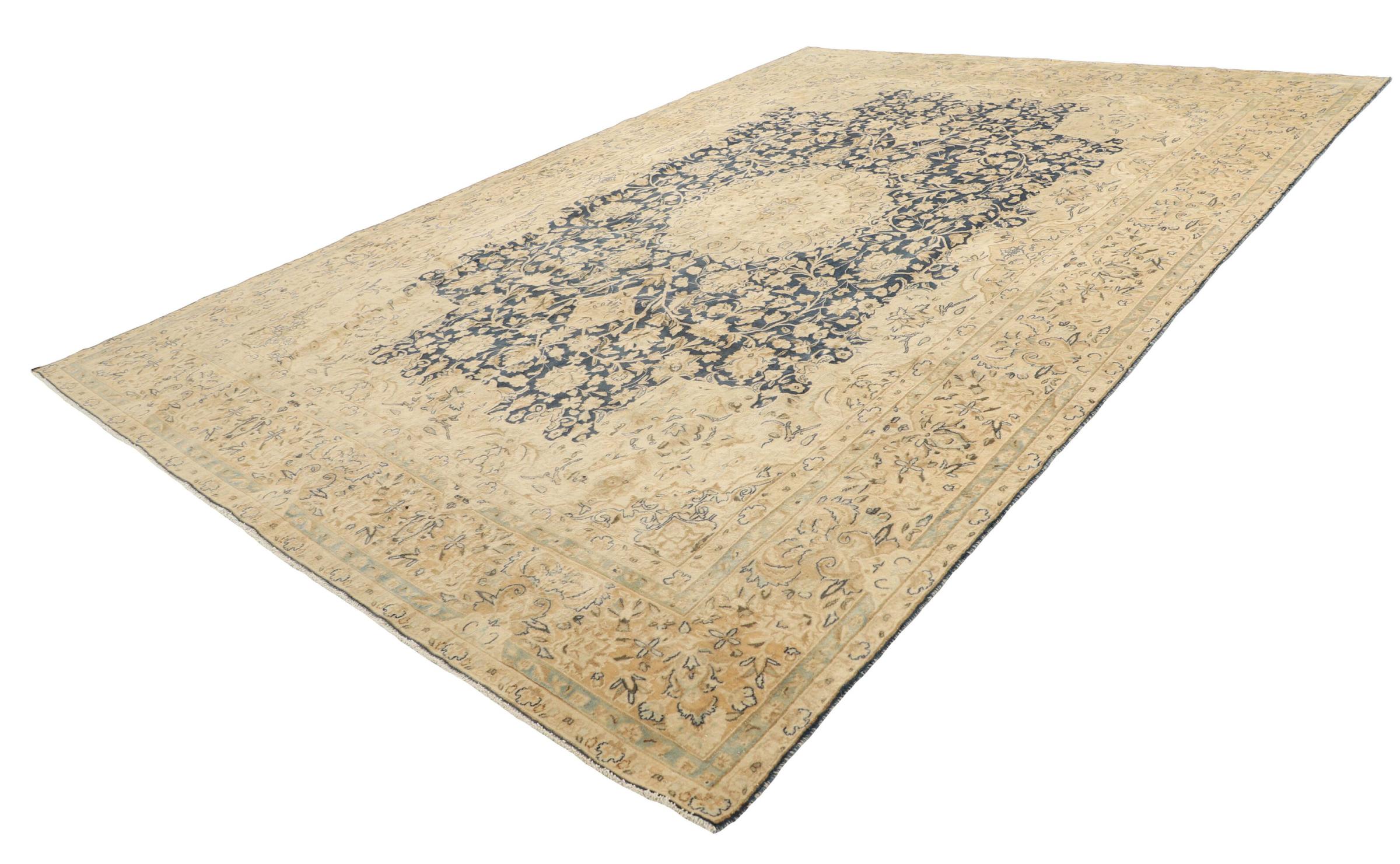 このようなヴィンテージのペルシャ絨毯は、間違いなくヴィンテージ絨毯の中でもハイライトです。 このカーペットは、世界で最も高く評価されている織物の産地の 1 つであるペルシャの都市ケルマーンで生産されています。 花の装飾、中央のメダリオン、そして非常に高品質のおかげで、ケルマーンのペルシャ絨毯は世界中で人気があります。 このヴィンテージ ケルマンもこれらの価値観に基づいています。 羊毛のパイルは平らに整えられ、専門的に再加工されています。 オリジナルのパターンや装飾は意図的に保存されています。 同時に、輪郭の色が変更され、エレガントなヴィンテージの外観が強調されました。