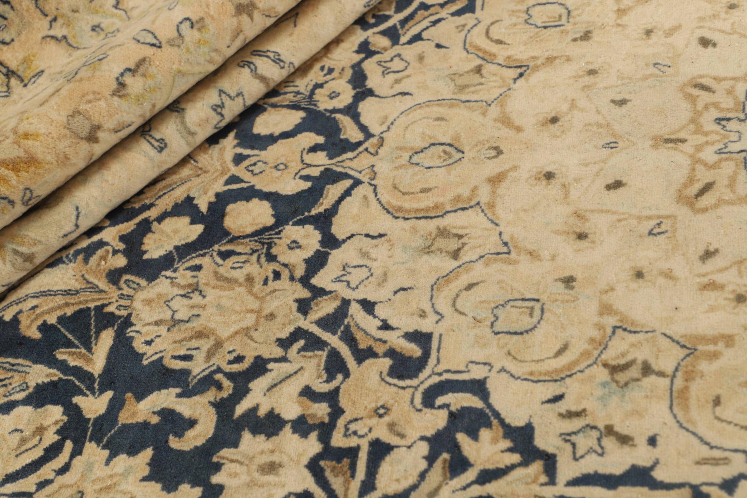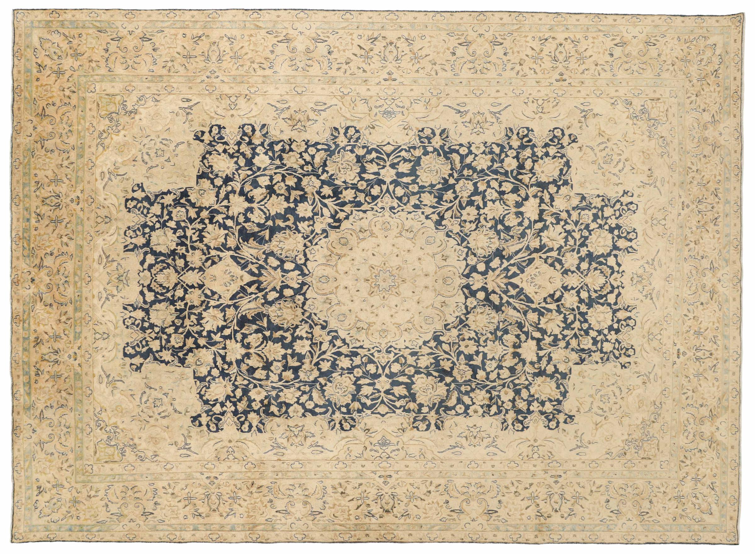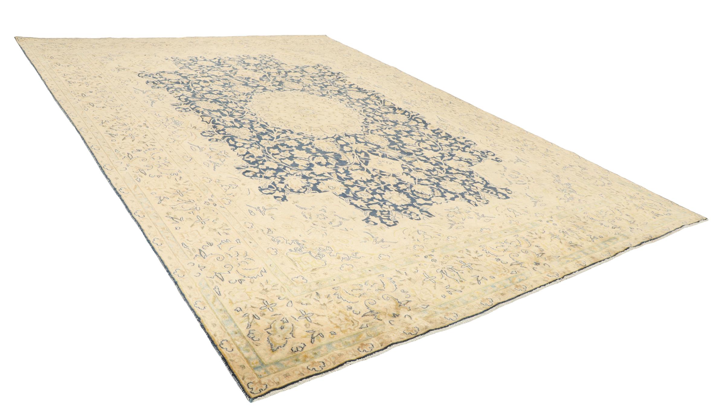 このようなヴィンテージのペルシャ絨毯は、間違いなくヴィンテージ絨毯の中でもハイライトです。 このカーペットは、世界で最も高く評価されている織物の産地の 1 つであるペルシャの都市ケルマーンで生産されています。 花の装飾、中央のメダリオン、そして非常に高品質のおかげで、ケルマーンのペルシャ絨毯は世界中で人気があります。 このヴィンテージ ケルマンもこれらの価値観に基づいています。 羊毛のパイルは平らに整えられ、専門的に再加工されています。 オリジナルのパターンや装飾は意図的に保存されています。 同時に、輪郭の色が変更され、エレガントなヴィンテージの外観が強調されました。