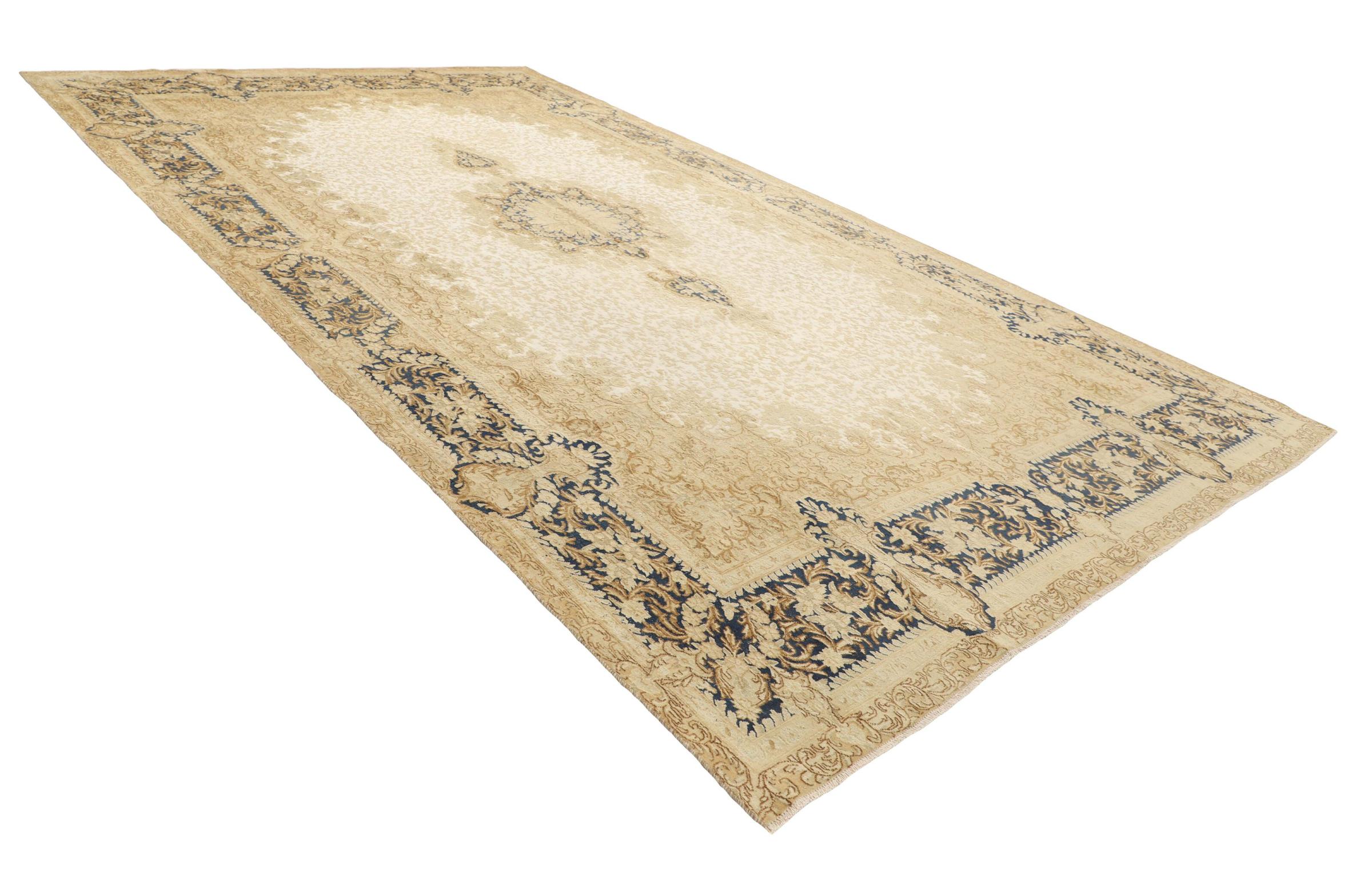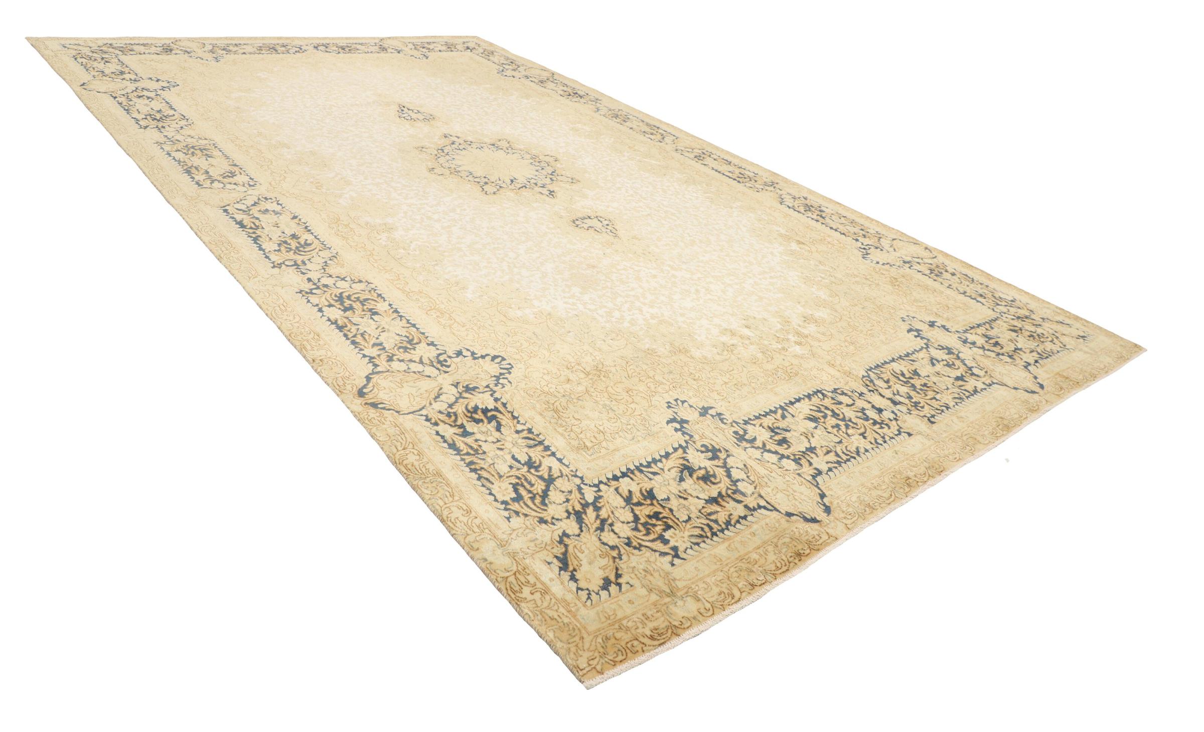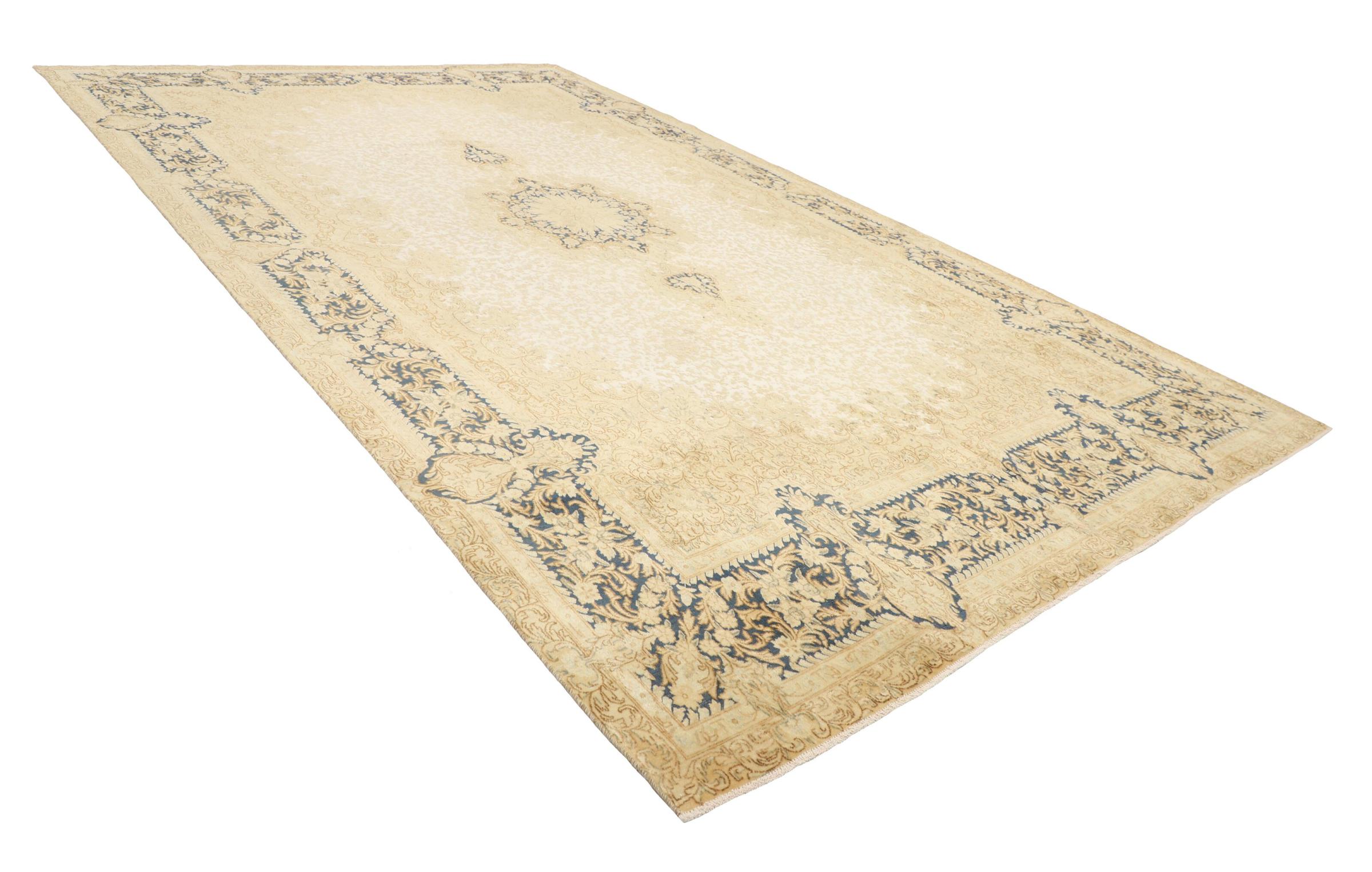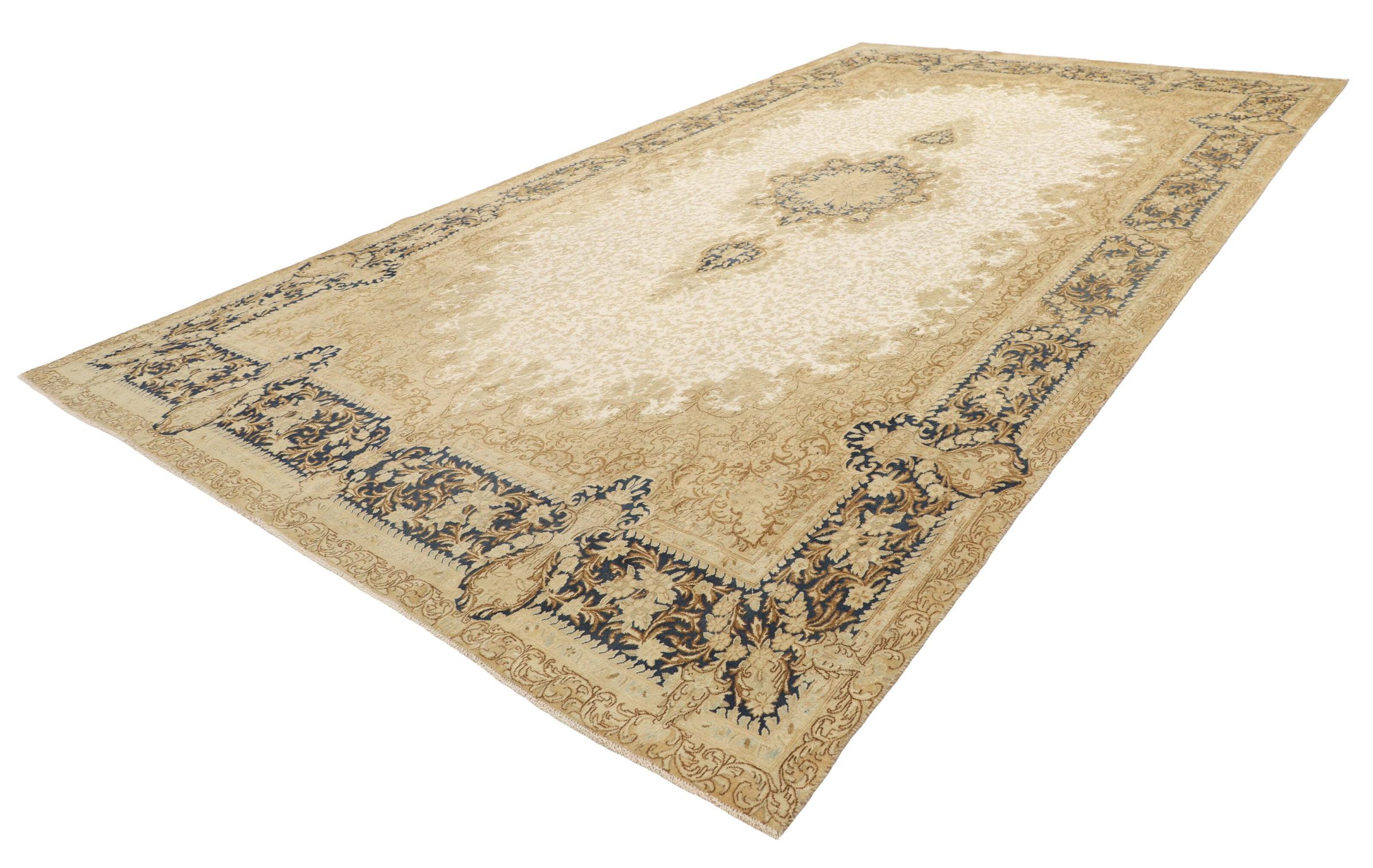 このようなヴィンテージのペルシャ絨毯は、間違いなくヴィンテージ絨毯の中でもハイライトです。 このカーペットは、世界で最も高く評価されている織物の産地の 1 つであるペルシャの都市ケルマーンで生産されています。 花の装飾、中央のメダリオン、そして非常に高品質のおかげで、ケルマーンのペルシャ絨毯は世界中で人気があります。 このヴィンテージ ケルマンもこれらの価値観に基づいています。 羊毛のパイルは平らに整えられ、専門的に再加工されています。 オリジナルのパターンや装飾は意図的に保存されています。 同時に、輪郭の色が変更され、エレガントなヴィンテージの外観が強調されました。