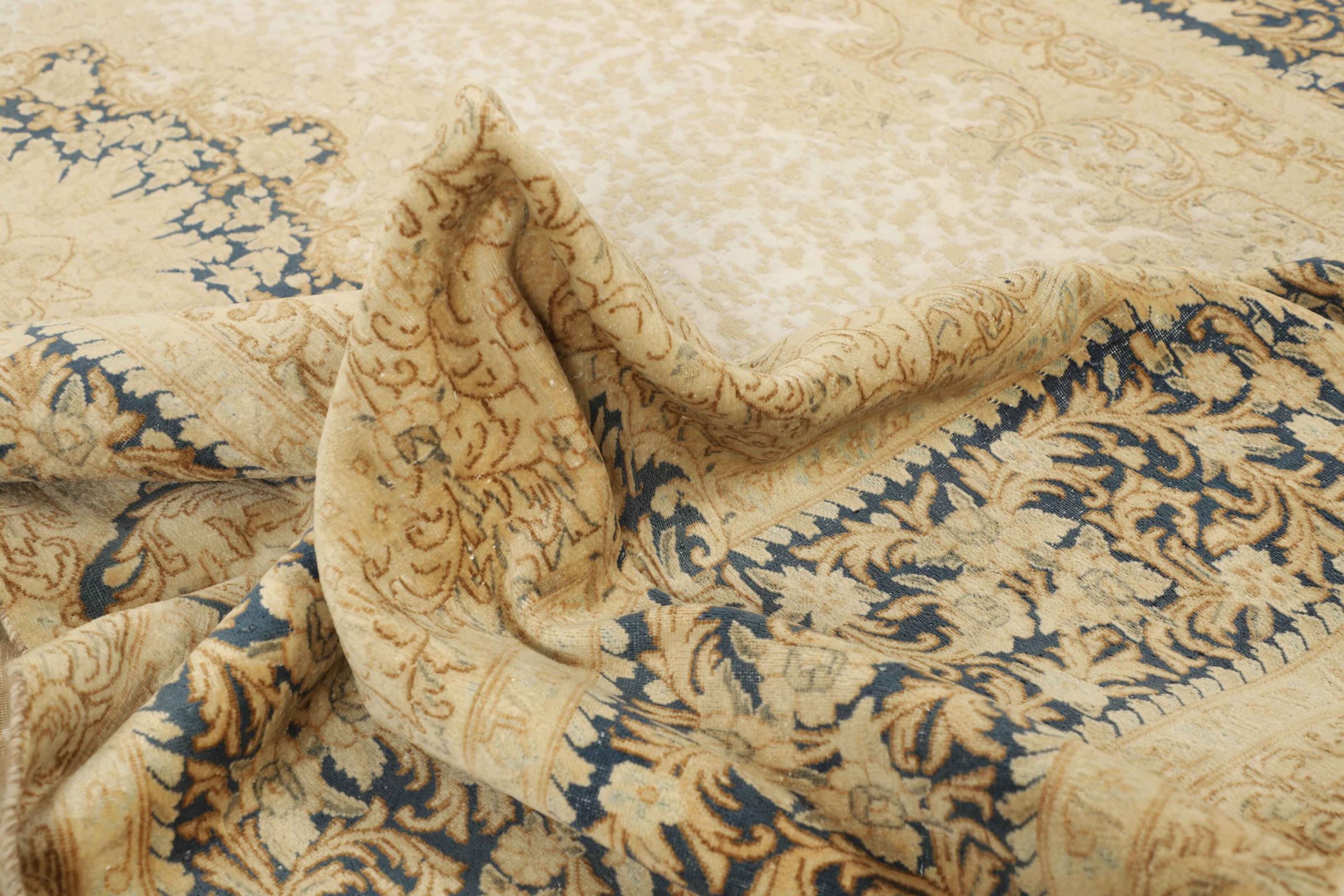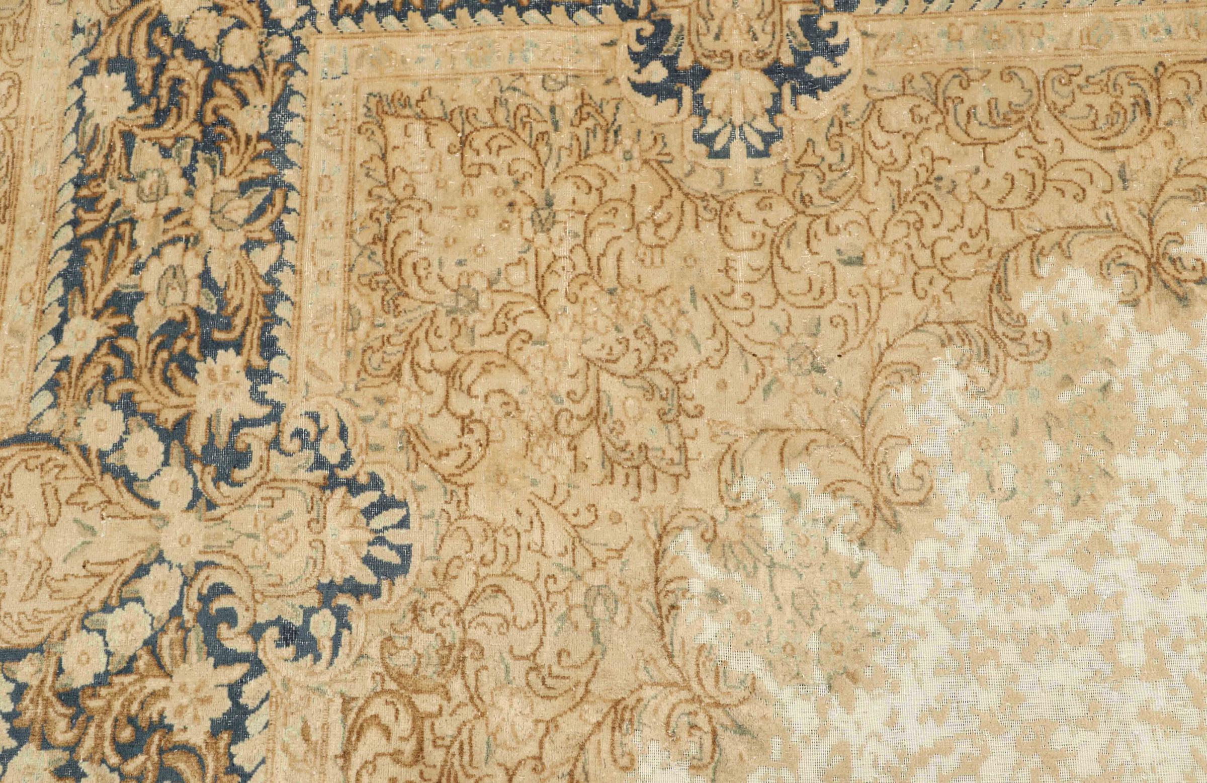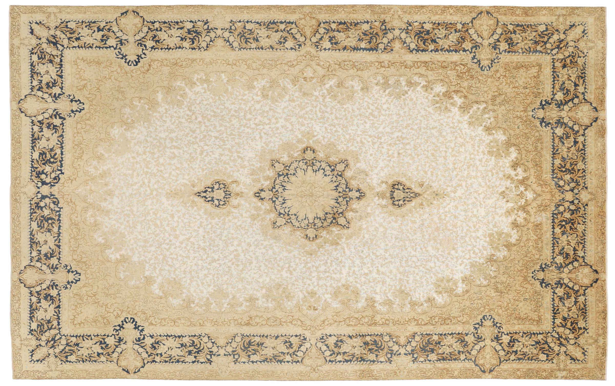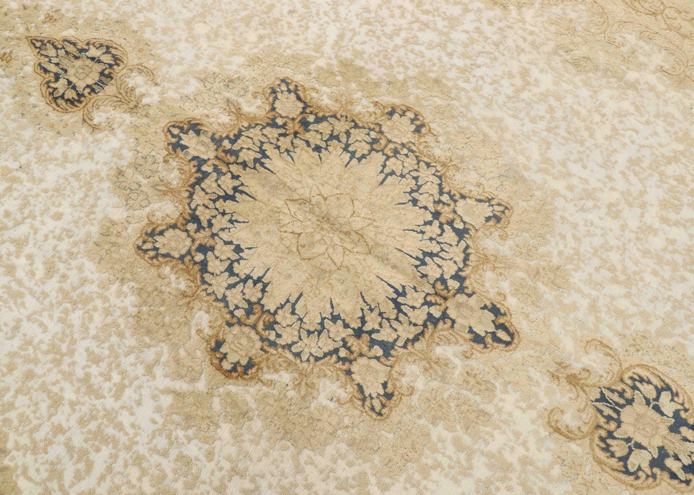 このようなヴィンテージのペルシャ絨毯は、間違いなくヴィンテージ絨毯の中でもハイライトです。 このカーペットは、世界で最も高く評価されている織物の産地の 1 つであるペルシャの都市ケルマーンで生産されています。 花の装飾、中央のメダリオン、そして非常に高品質のおかげで、ケルマーンのペルシャ絨毯は世界中で人気があります。 このヴィンテージ ケルマンもこれらの価値観に基づいています。 羊毛のパイルは平らに整えられ、専門的に再加工されています。 オリジナルのパターンや装飾は意図的に保存されています。 同時に、輪郭の色が変更され、エレガントなヴィンテージの外観が強調されました。